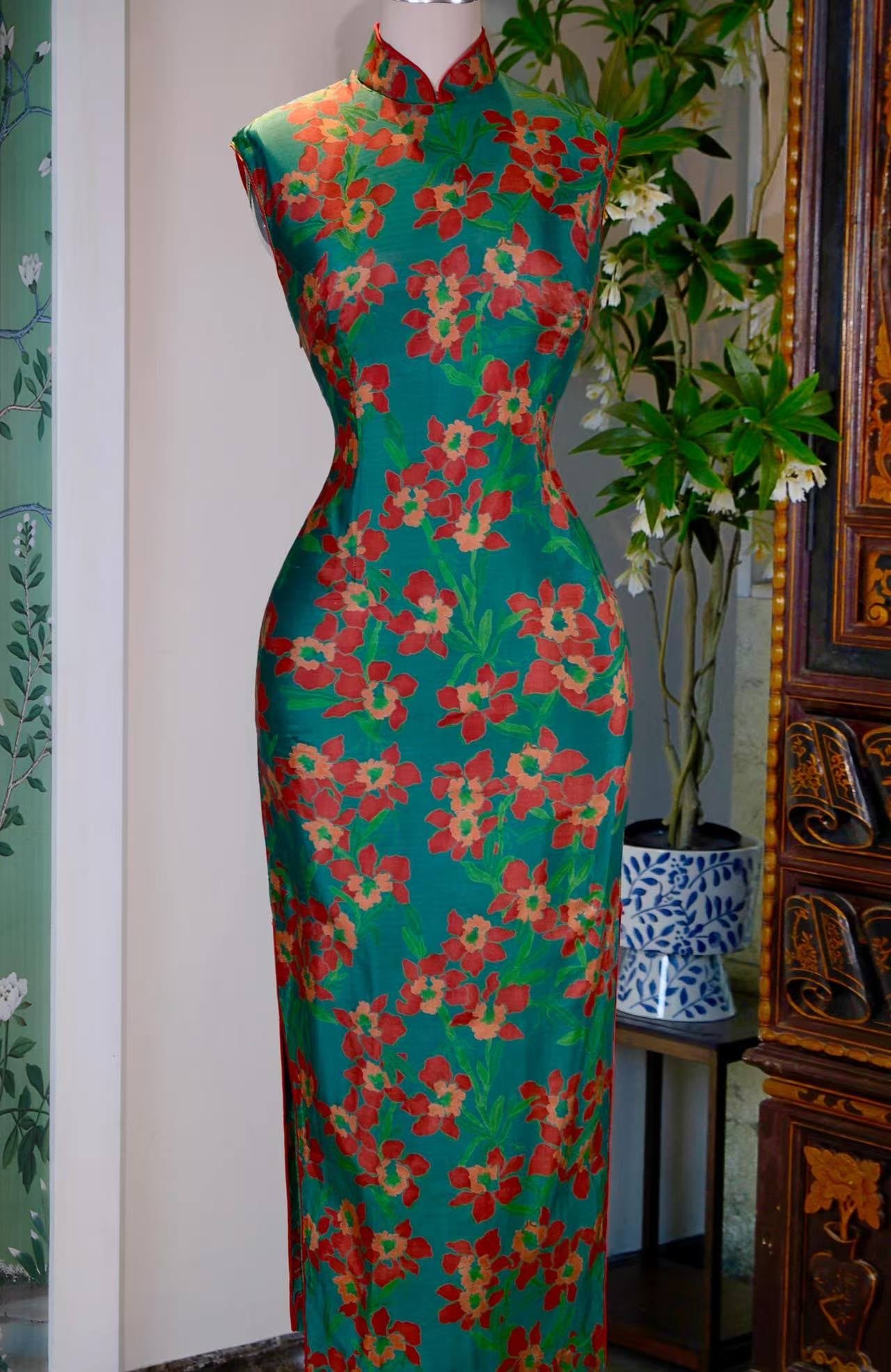 60年代 - 红肥绿瘦·六十年代香港艳丽印花斜纹绸古董旗袍 | 1960s - Red Fleshy, Green Lean: A 1960s Hong Kong Vintage Cheongsam in Vibrant Printed Twill Silk