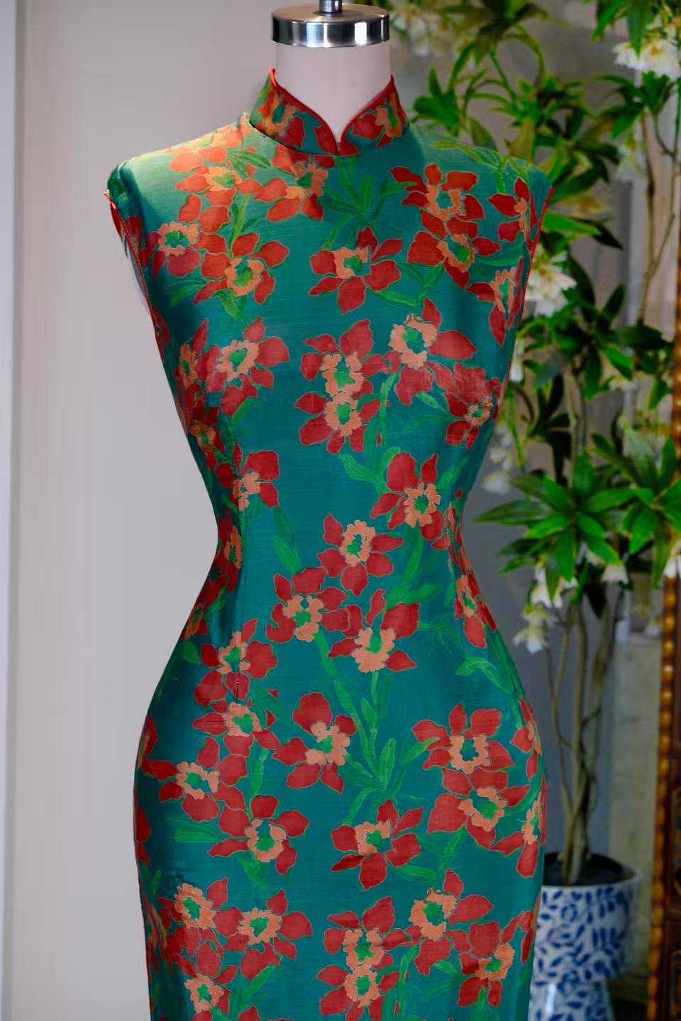 This green-base, red-floral cheongsam is not only the fashion statement of 1960s Hong Kong women but also a flowing cultural history. It takes the poetic meaning of Li Qingzhao as its structure, the East-West blended design as its blood, and the skill of manual printing as its soul, becoming increasingly precious through the cleansing of time. When we look at these antique cheongsams that have faded but not lost their brilliance, we are touching the heartbeat of an era—a golden age where tradition clashed with modernity, and East conversed with West. This "Red Blooms on Green" cheongsam is the most vibrant footnote to that time.