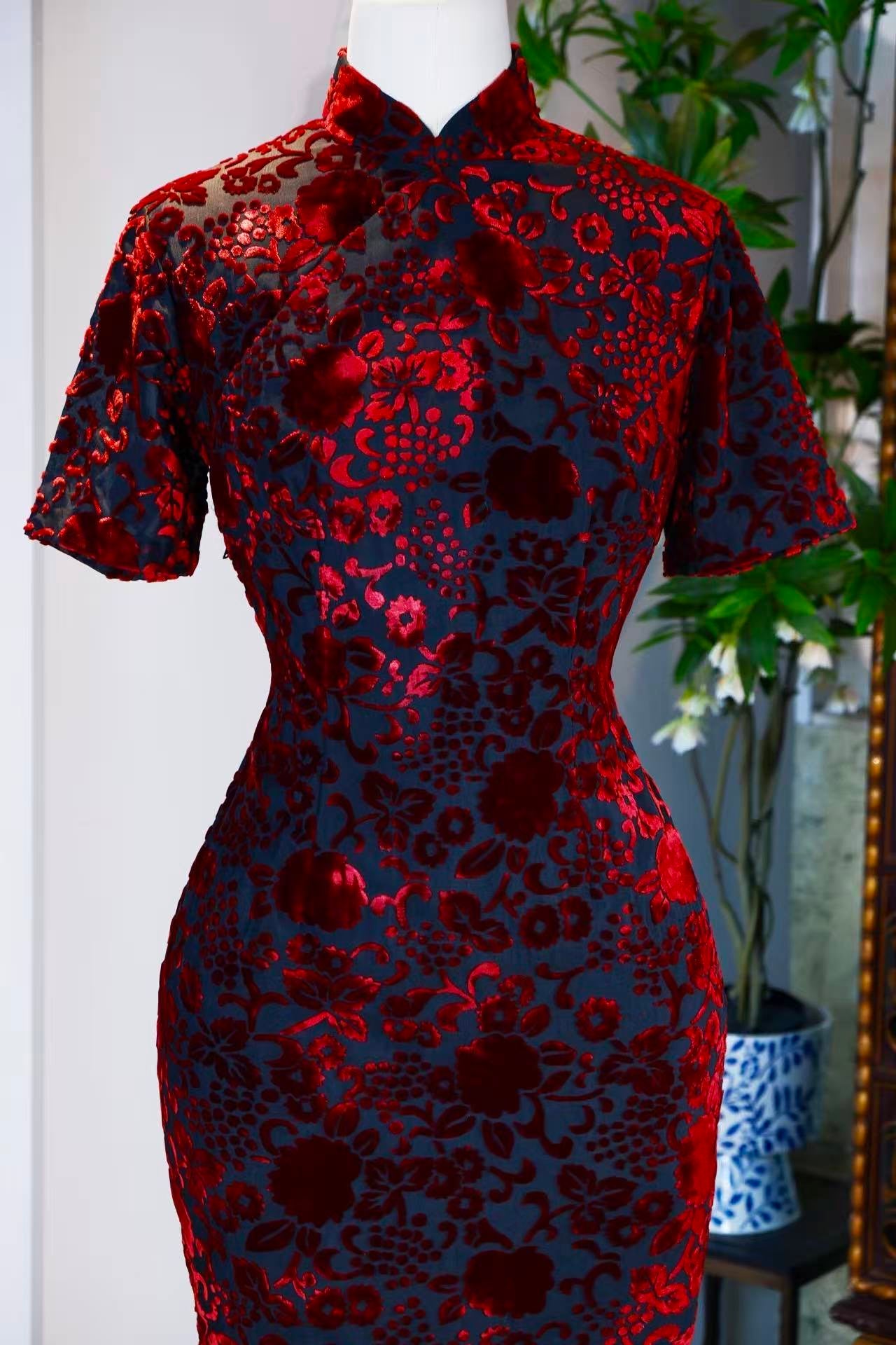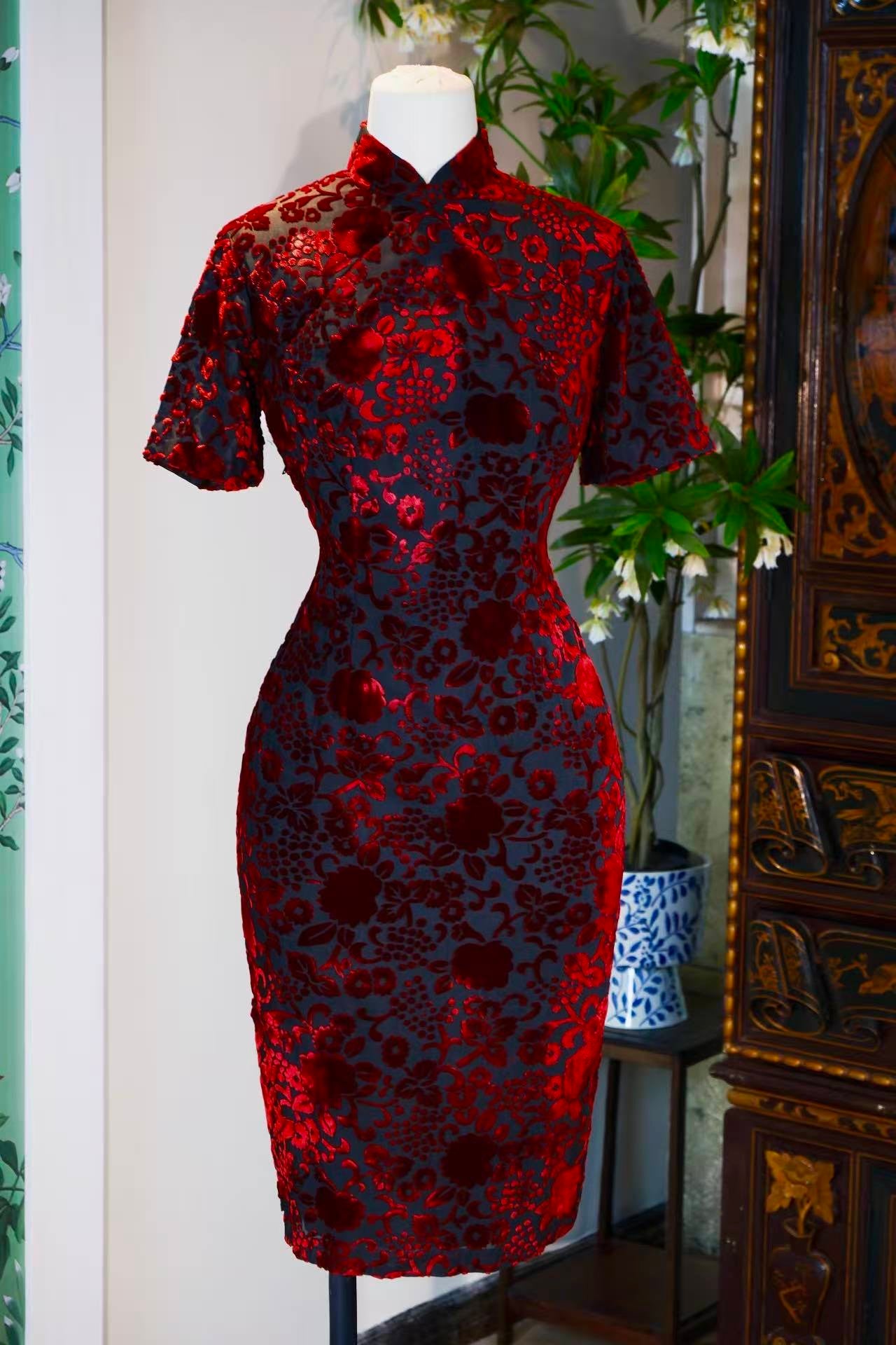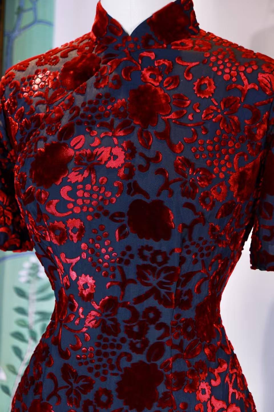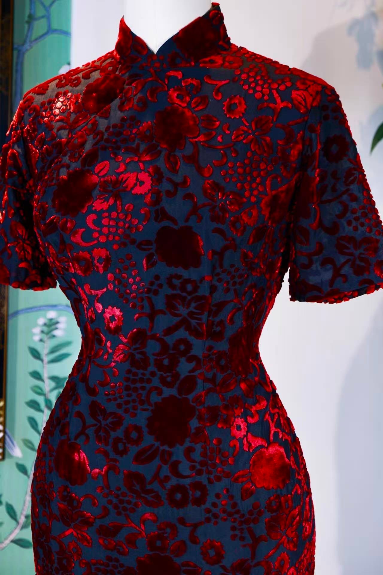 旗袍周身满布缠枝花卉纹,绛红丝绒在光线流转中显化出深浅渐变:
