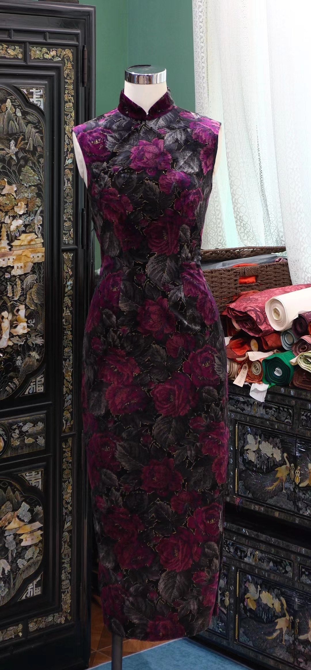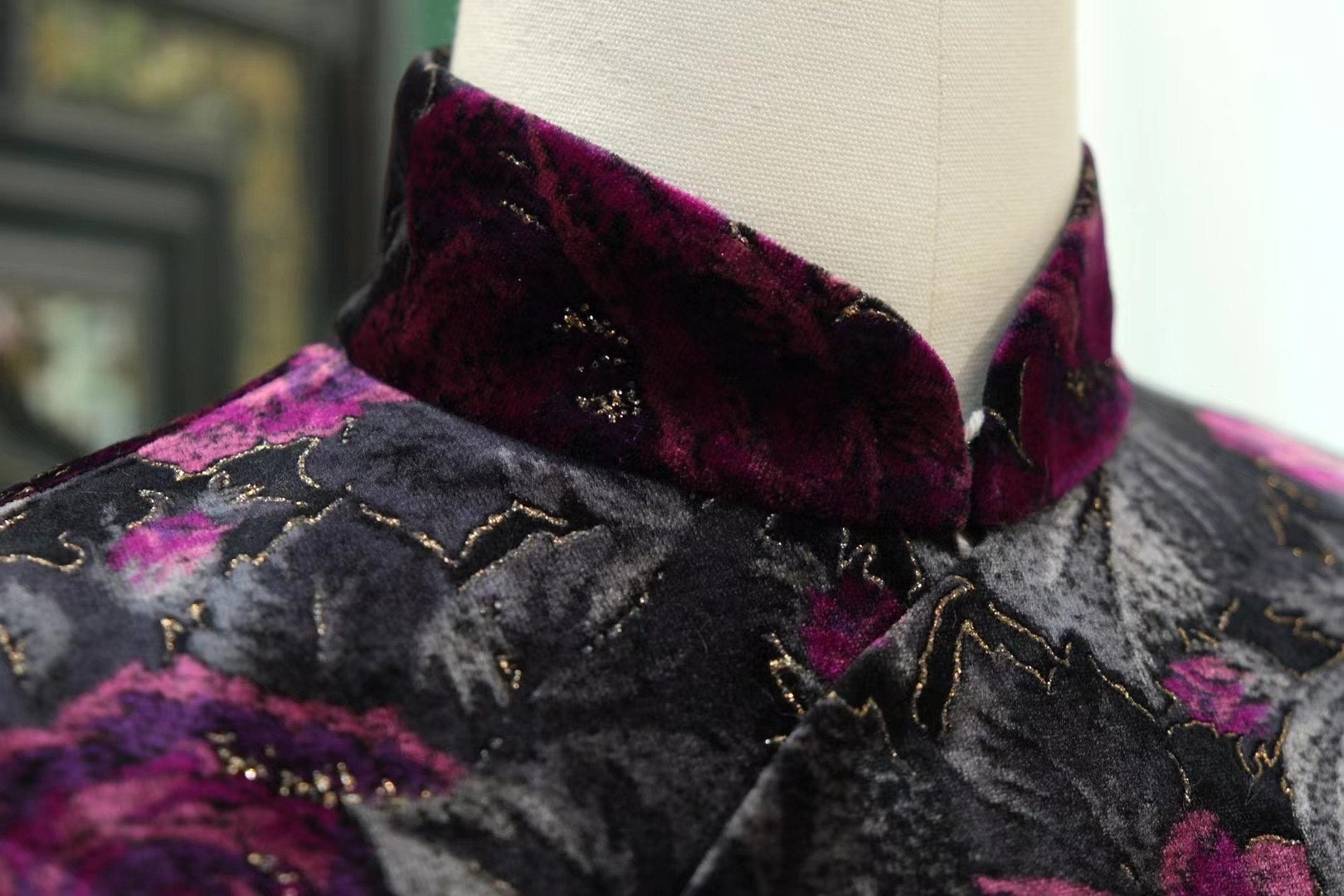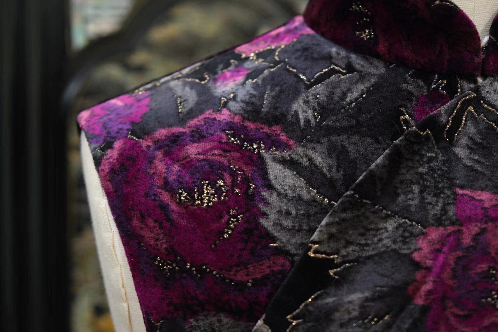 • The Pinnacle of Fabric Craftsmanship: The Qipao is constructed from a rare and precious Velvet or Flocked fabric. The raised jacquard (Flock Printing/Devoré) technique makes the floral motifs incredibly three-dimensional. The inherent nature of the velvet provides a deep luster and exquisite softness.