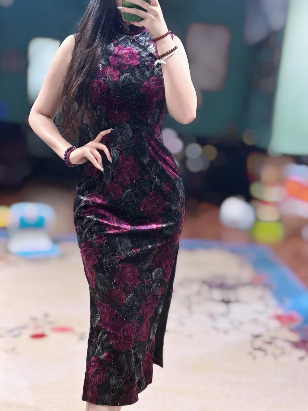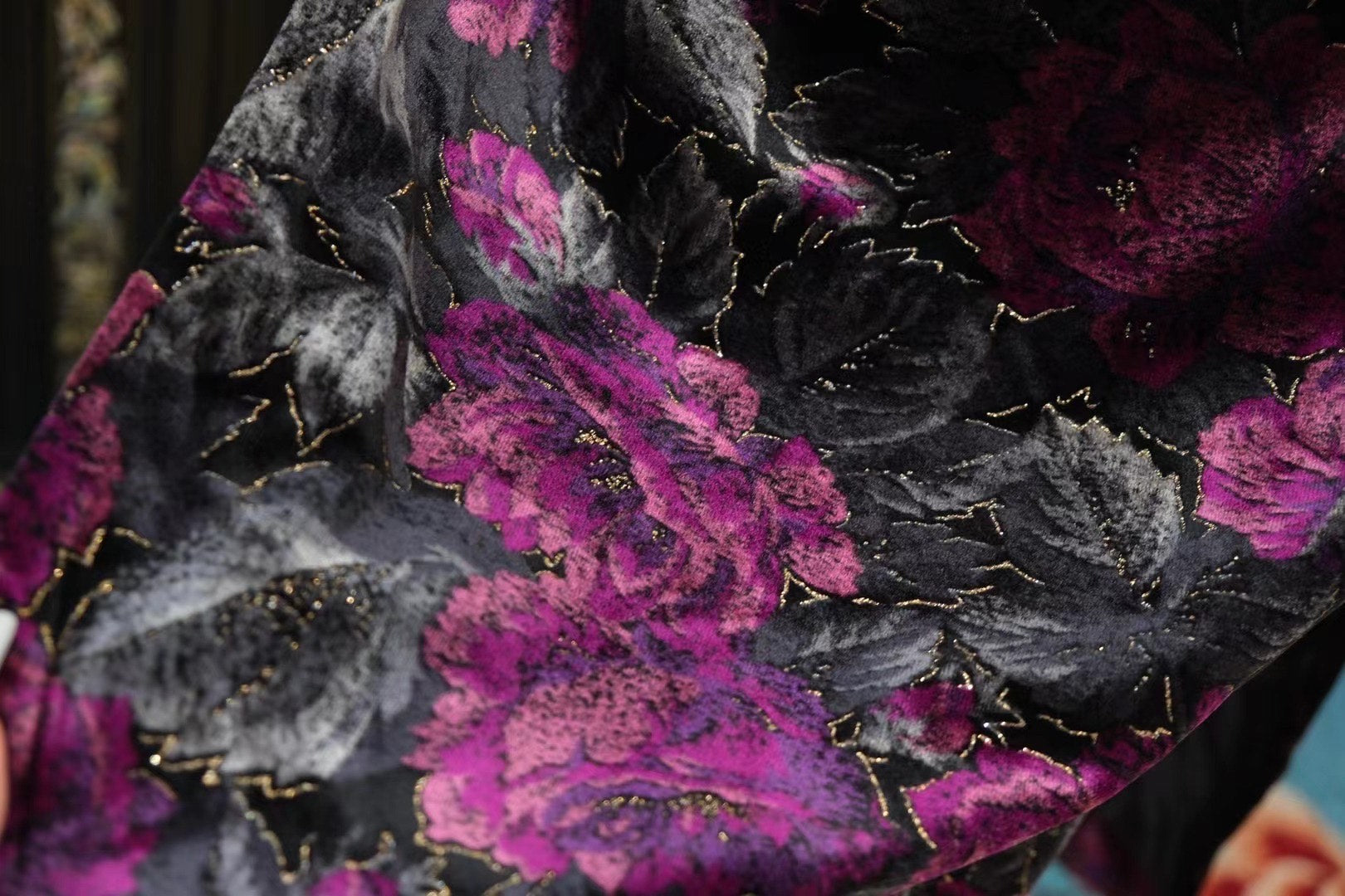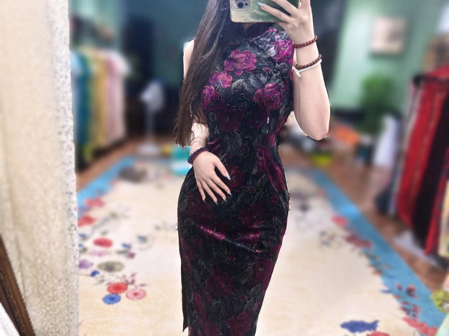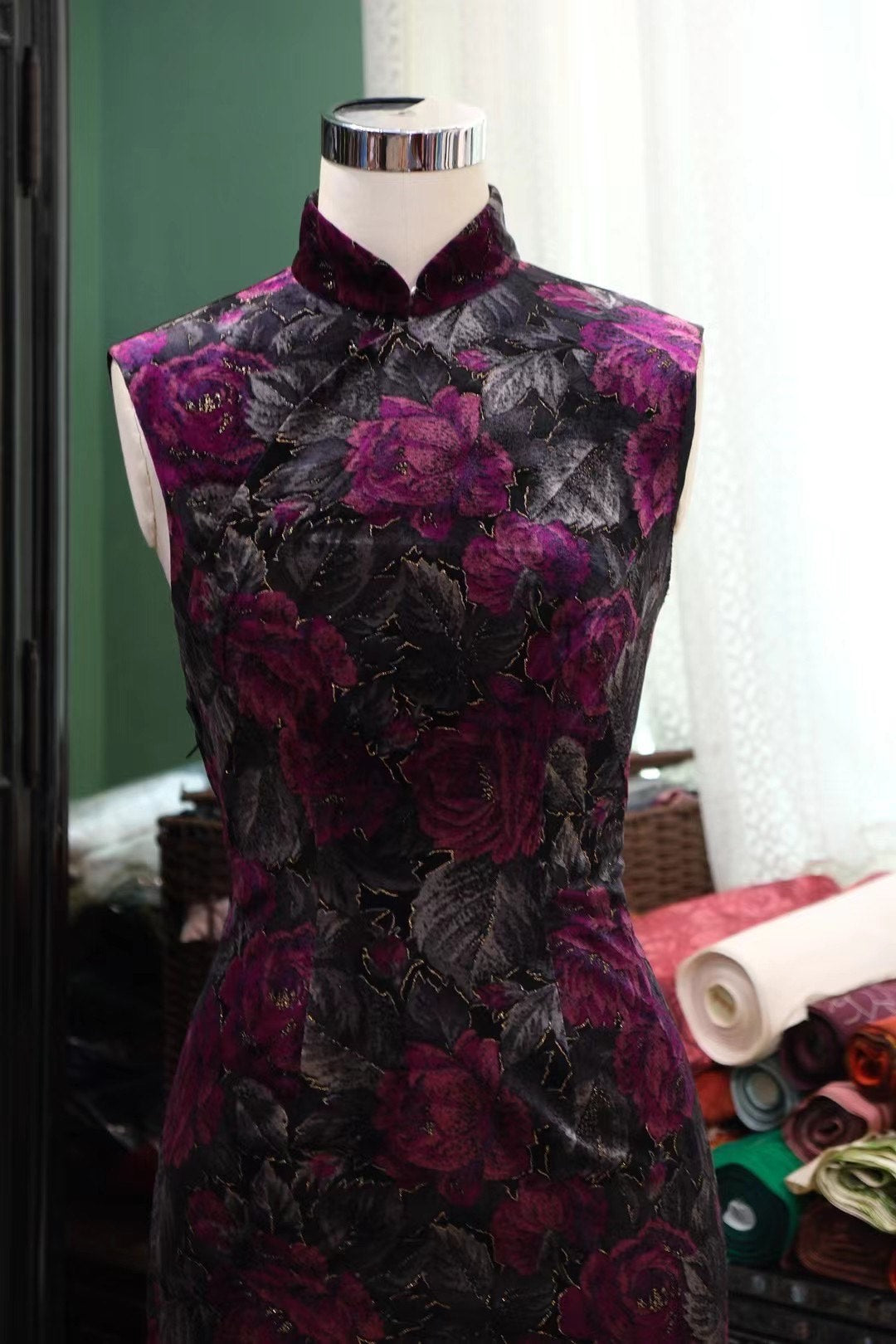 • The Pinnacle of Fabric Craftsmanship: The Qipao is constructed from a rare and precious Velvet or Flocked fabric. The raised jacquard (Flock Printing/Devoré) technique makes the floral motifs incredibly three-dimensional. The inherent nature of the velvet provides a deep luster and exquisite softness.