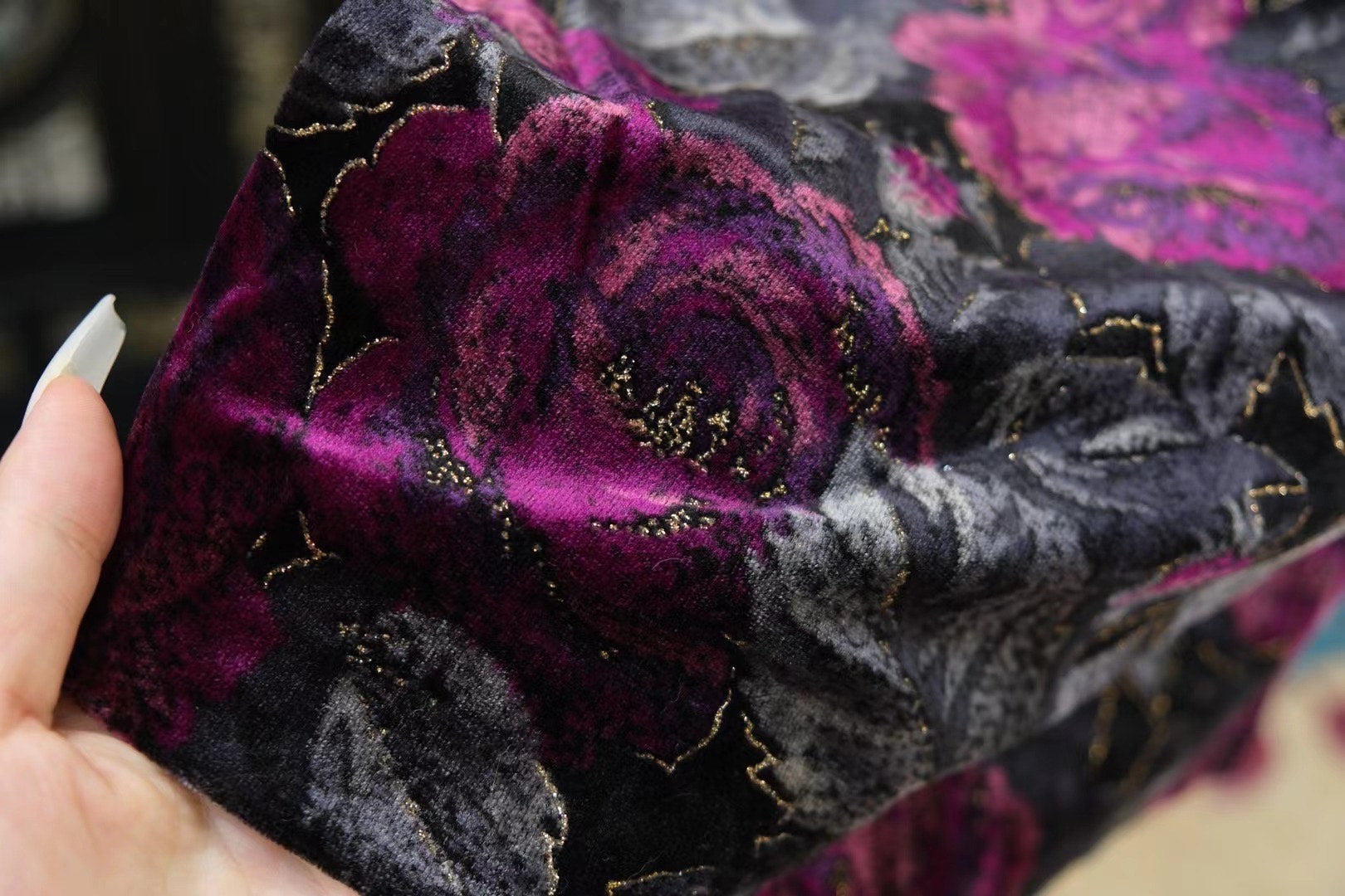 • The pattern features large, blooming Rose motifs and foliage. The purple flowers achieve a rich, vibrant density due to the velvet texture.
