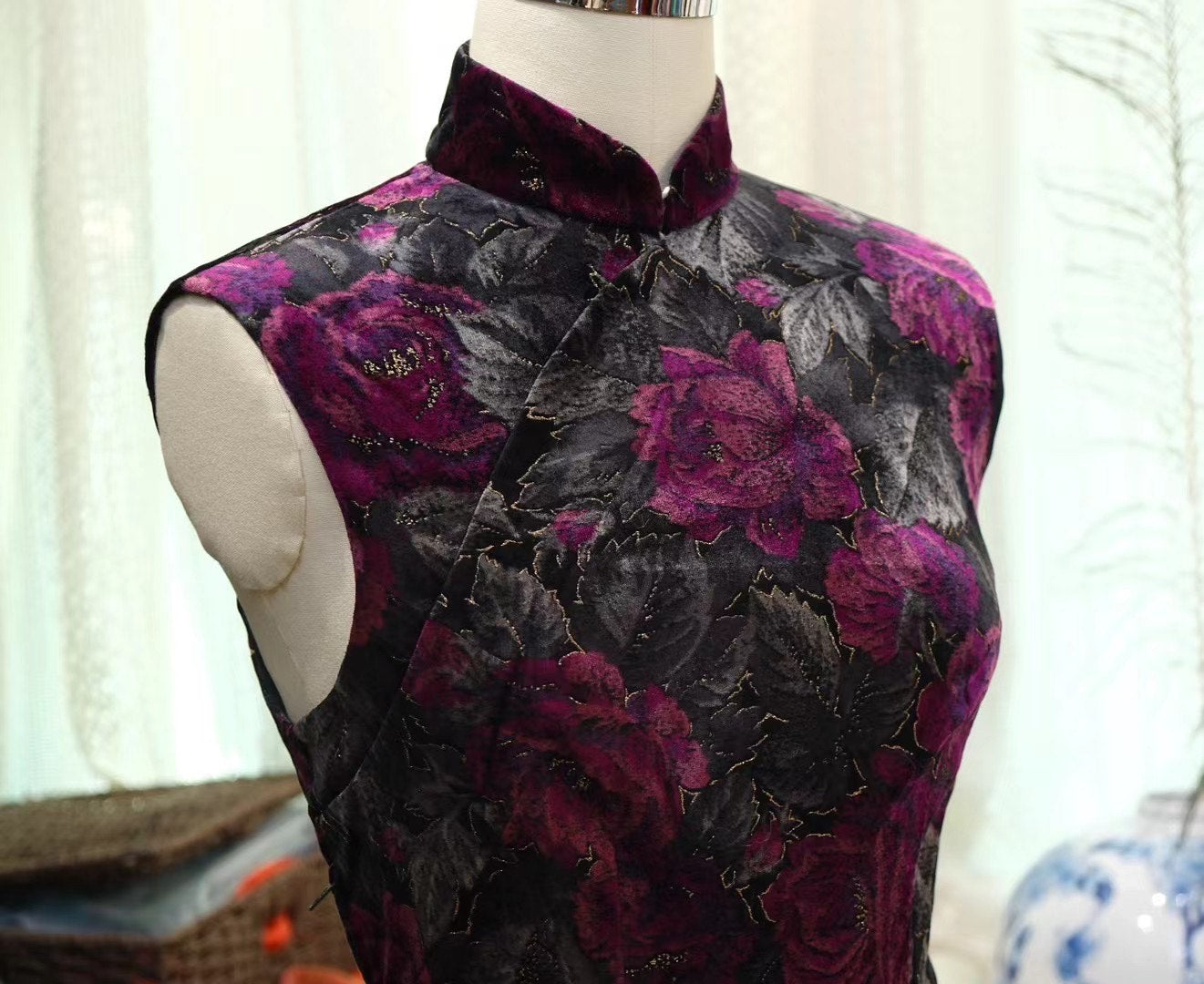 60年代 - 老上海风情:紫黑撞色丝绒浮雕金丝玫瑰无袖古董旗袍 | 1960s - Old Shanghai Opulence: Plum & Black Contrasting Velvet Gold-Thread Raised Rose Sleeveless Vintage Qipao/Cheongsam