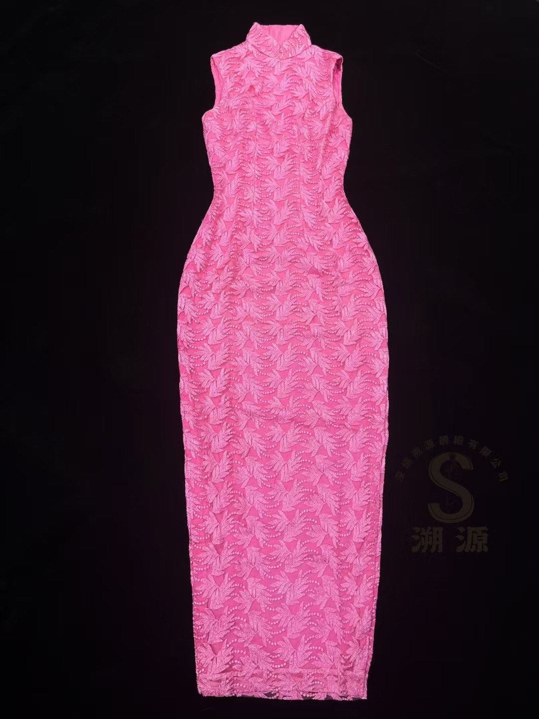 60年代 -【艳压群芳 • 霓虹粉立体叶纹蕾丝长款无袖古董旗袍】| 1960s - “Fuchsia Siren” - Floor-Length Antique Qipao with Vibrant Pink Three-Dimensional Leaf Lace and Sleeveless Design.