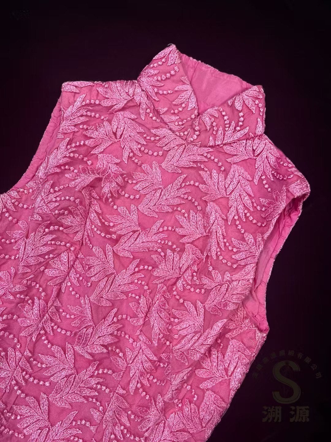 这件古董旗袍,以其大胆而热烈的色彩,瞬间将我们带回那个追求个性和张扬的摩登年代。它通体覆盖着一层抢眼的霓虹粉(或称荧光玫红),这种充满活力的色调,是东方女性突破含蓄、展现自信与魅力的绝佳载体。