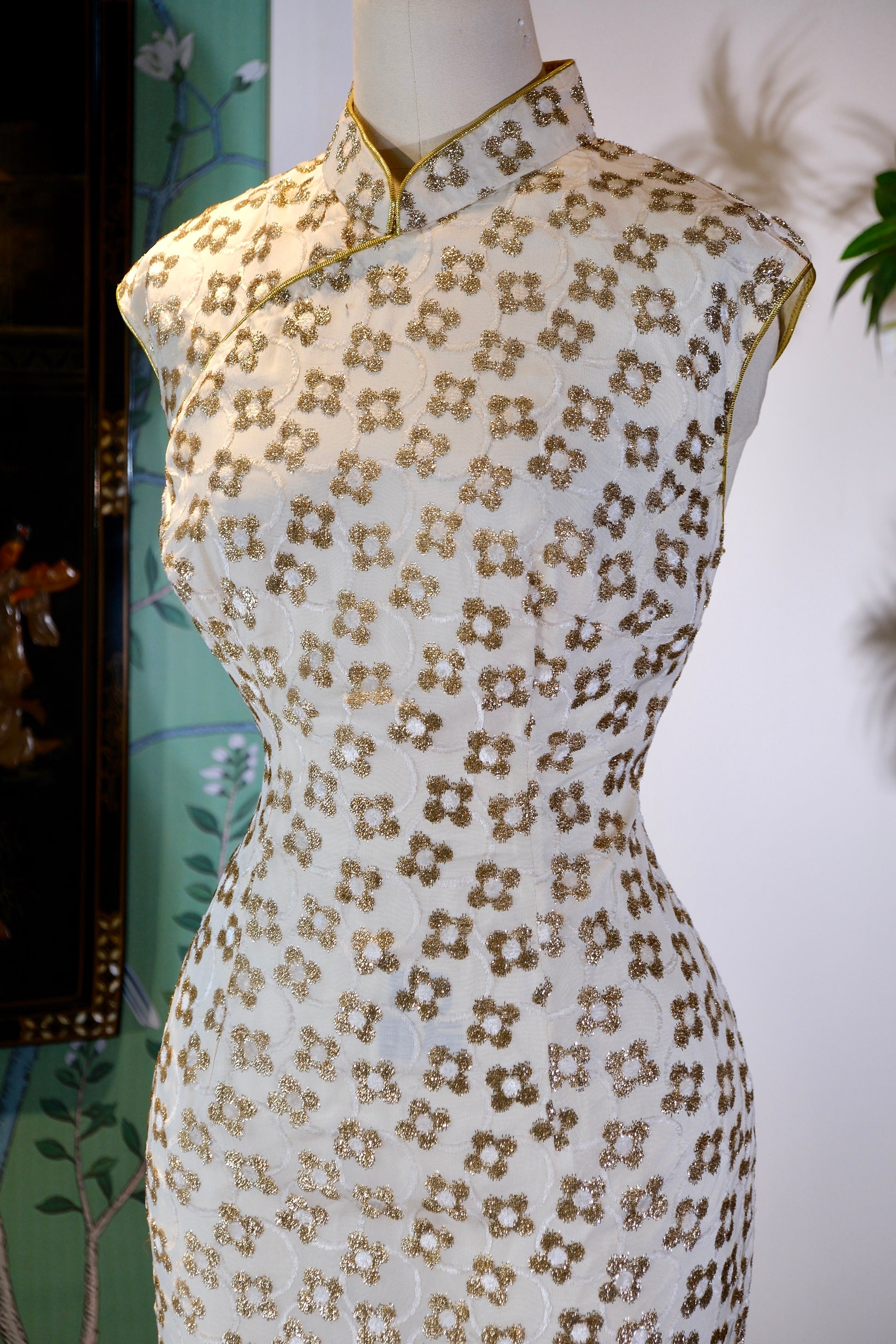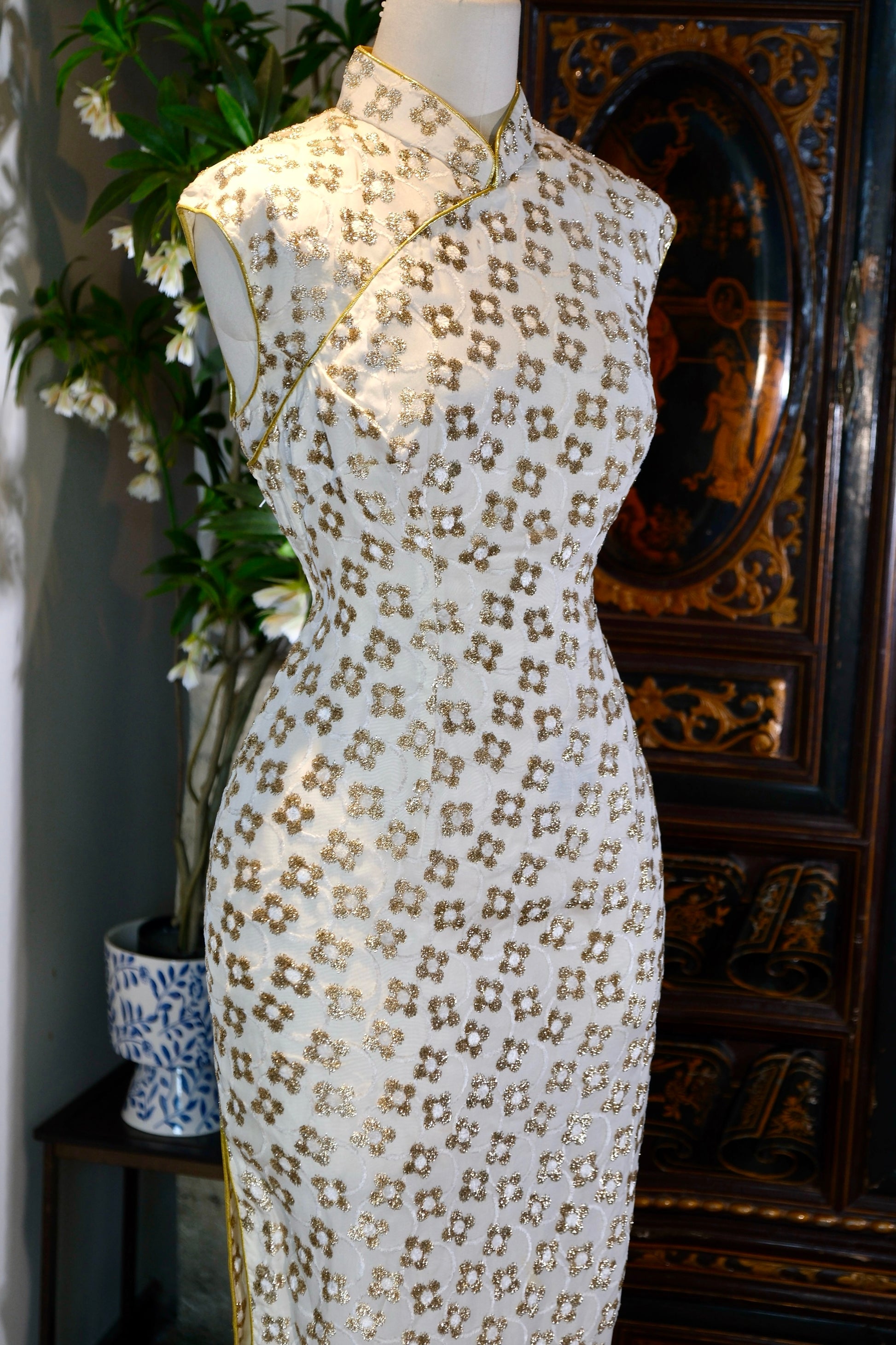 This antique qipao, crafted in 1960s Hong Kong, features imported Italian gold-woven devoré (cut) velvet, fusing the grace of Oriental tailoring with the opulence of Western textile arts. The entire garment is adorned with a dense geometric floral motif—four-petaled flowers woven with gold thread scatter like stars, anchored by a rhythmic diamond lattice across a creamy-white velvet base. Each blossom is sculpted through the devoré process, creating a relief-like protrusion. To the touch, it offers both the supple softness of velvet and the crisp structure of gold thread; as light ripples across it, the fabric seems to condense the shimmering reflections of Victoria Harbour into its very fibers.