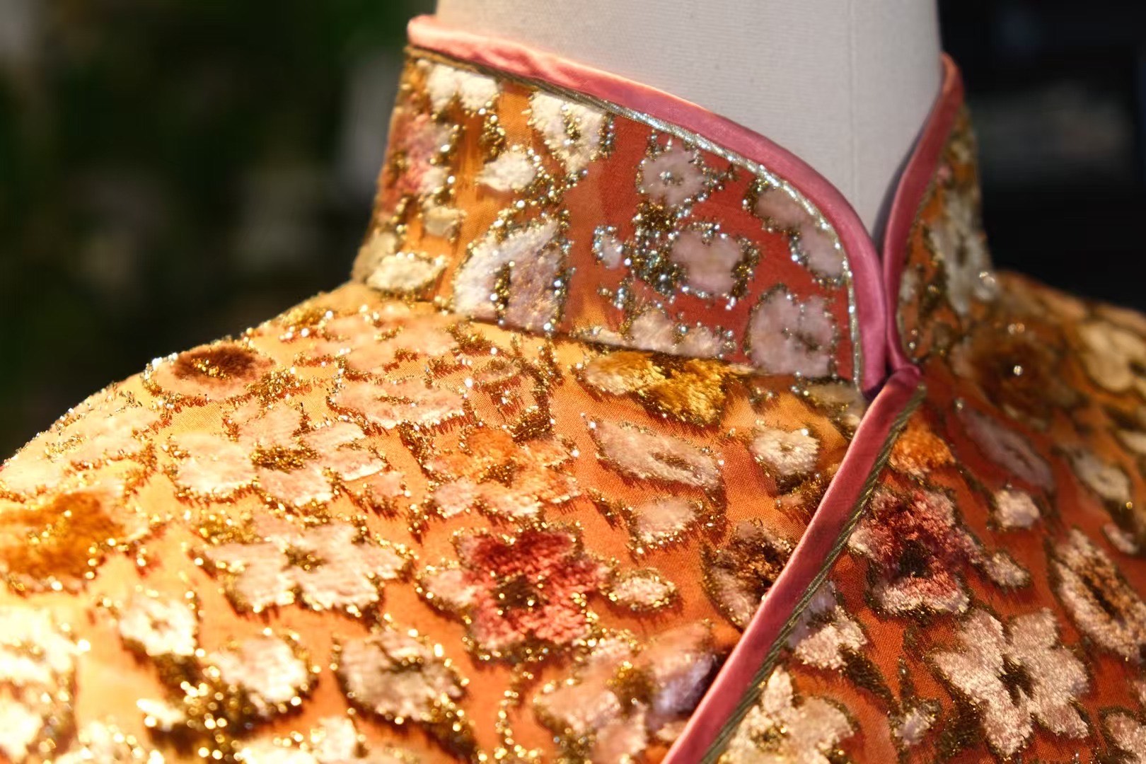 两件旗袍以极其繁复的**金银线提花(或闪光植绒)**面料织就,密集的花卉图案遍布全身,在光影流转间闪耀着熠熠光芒,尽显富丽堂皇。
