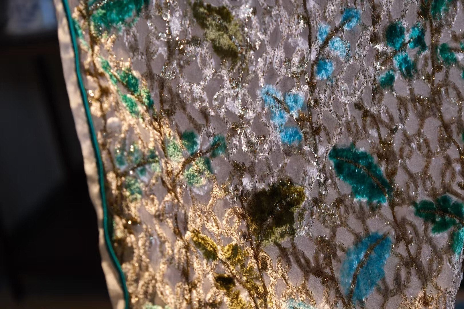 这件则以晶莹透亮的银白为基底,点缀着清新翠绿与湖蓝色的花叶,犹如清澈湖水中的珍宝,散发着清冷高贵的光芒。金银线的交织赋予其冰雪般的质感,体现了穿戴者的高洁与内敛。