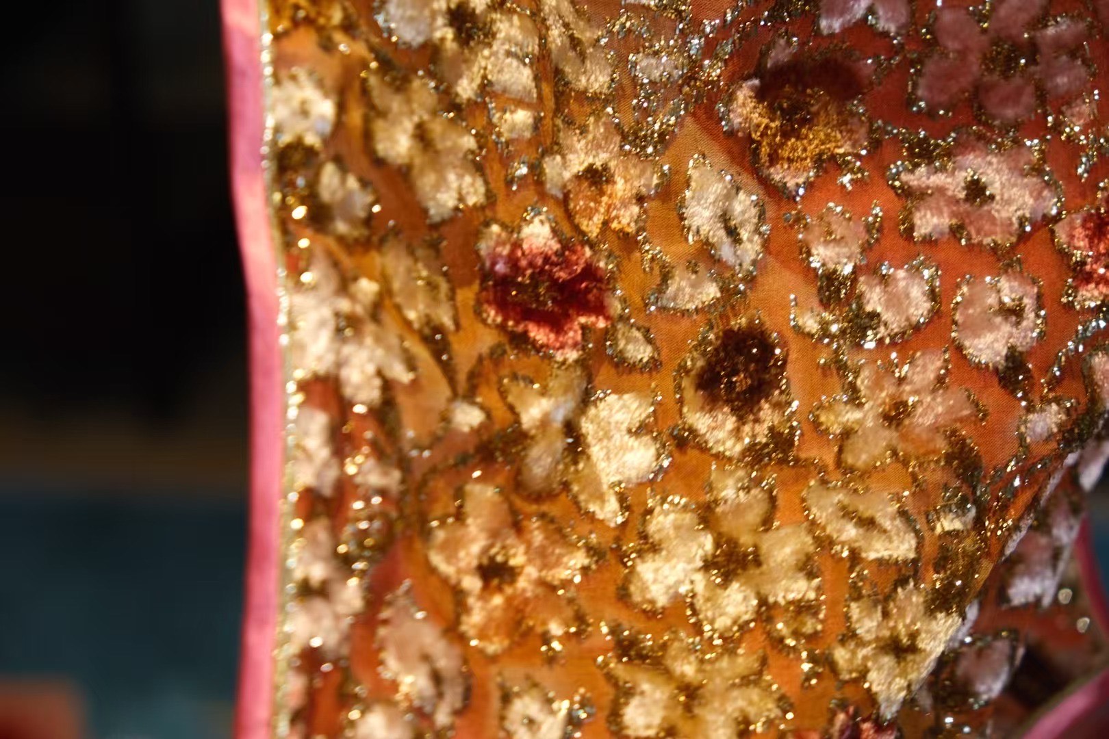 这件以温暖的杏橘色调为底,融入柔和的粉白与淡金,宛如清晨第一缕阳光穿透丝绸,色彩温柔而阳光。它如同一幅精美的油画,温暖的渐变晕染效果,传递出穿戴者温婉而明媚的气息。
