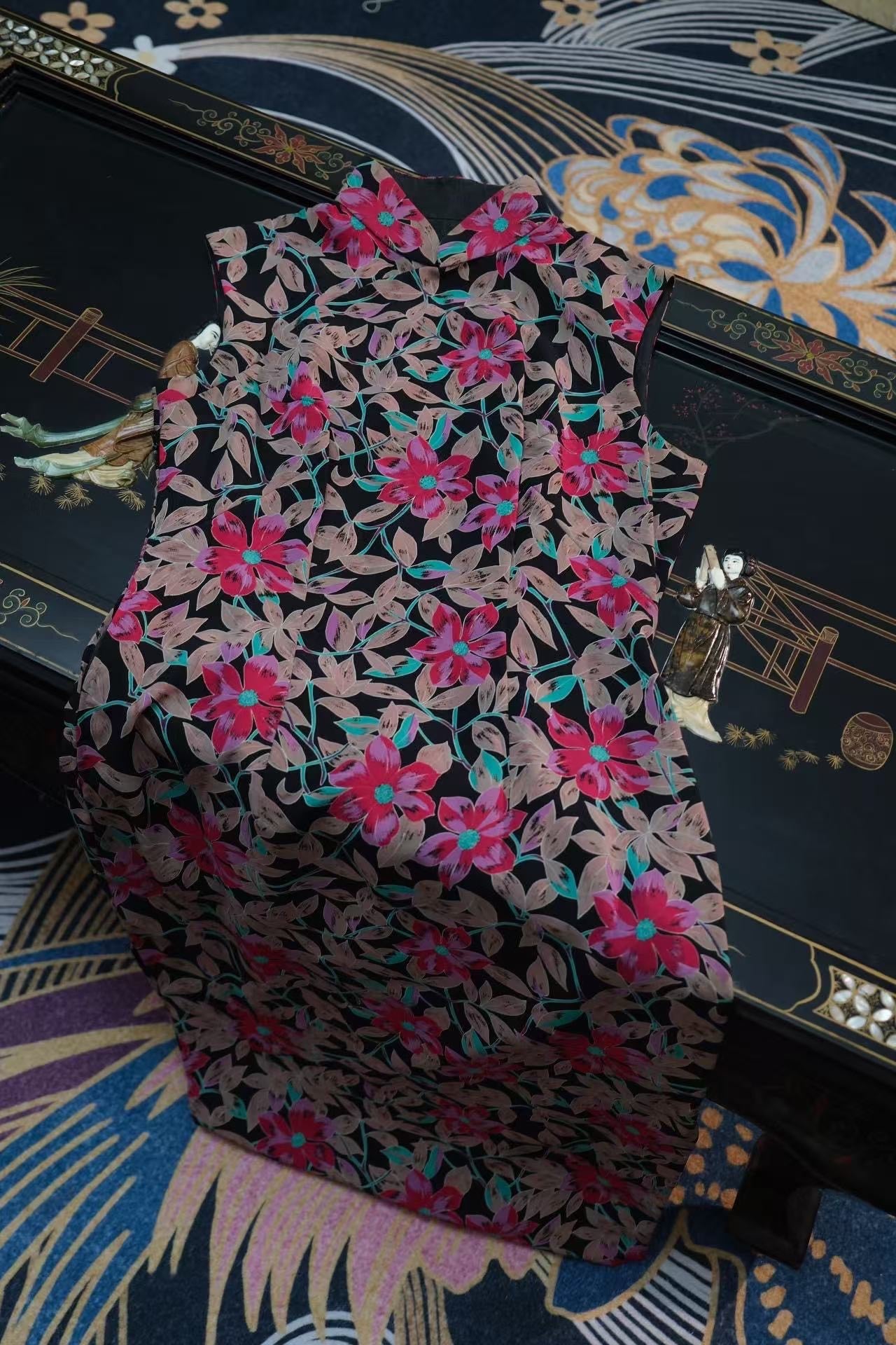 This Vintage 60s sleeveless Cheongsam perfectly captures the mod and vibrant glamour of Hong Kong in that era. It is like a flowing poem and a passionate painting, merging the graceful silhouette of the traditional Cheongsam with the tailored lines of Western fashion.