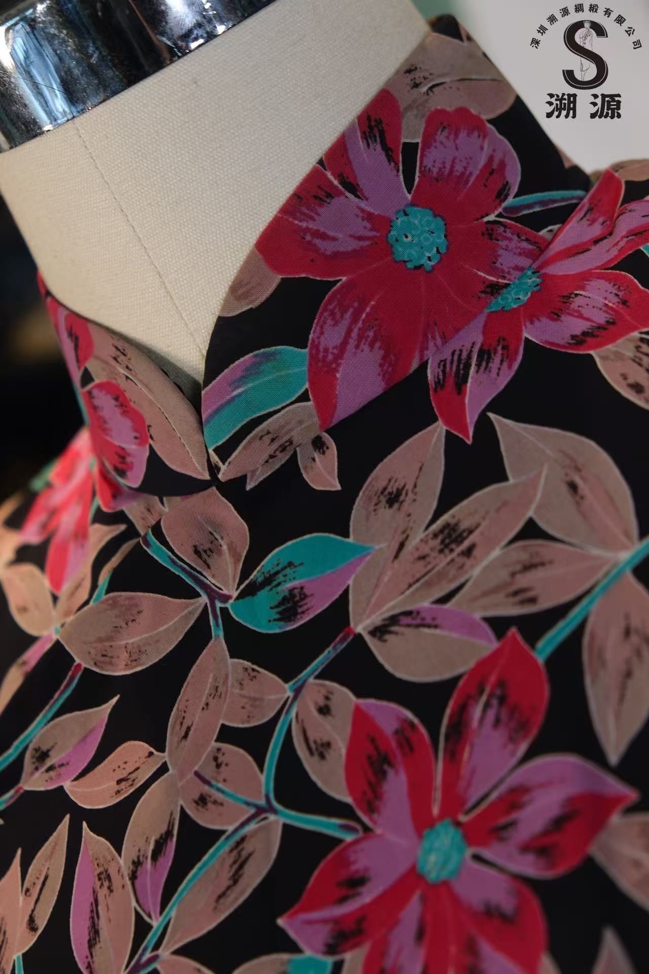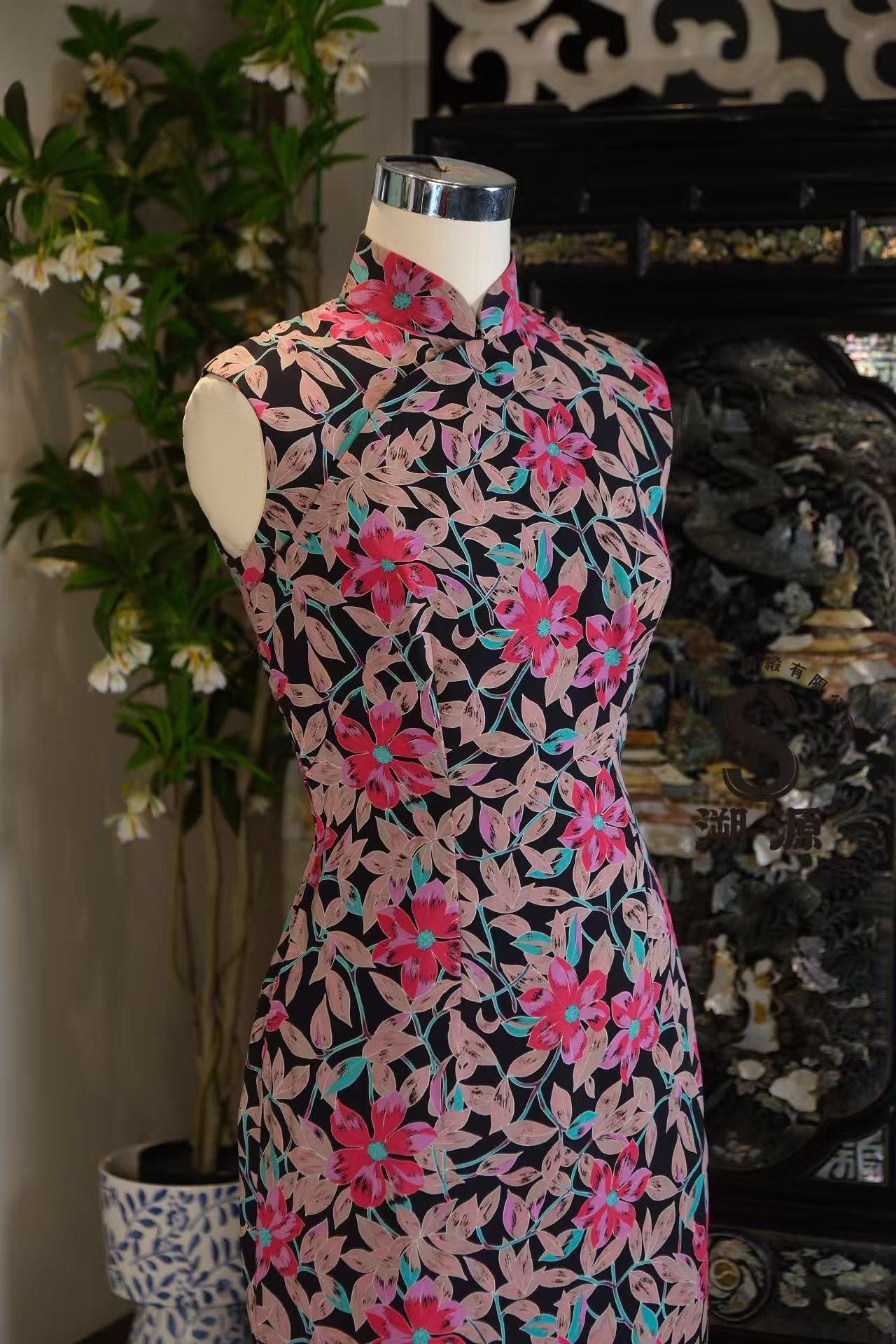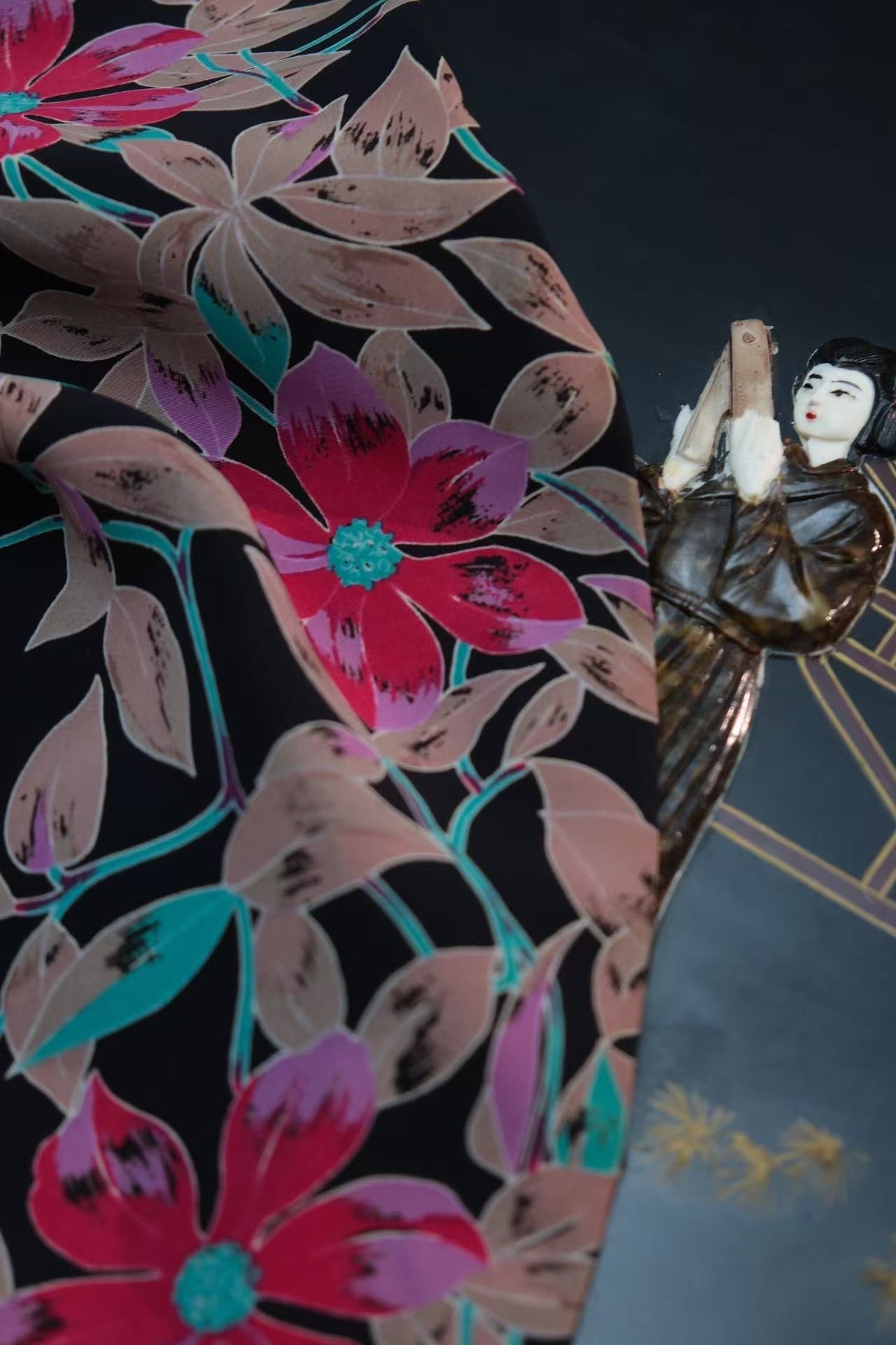 旗袍以深邃的黑色为底,承载着战后复苏年代大胆而充满生命力的印花设计。繁复而精致的粉色和湖水蓝花朵在黑夜中绚烂绽放,犹如夜空中瞬间点燃又永恒定格的烟火,带来强烈的视觉冲击,令人目不暇接。这种鲜明、高对比度的花纹,正是60年代时尚突破与现代精神的最佳体现。
