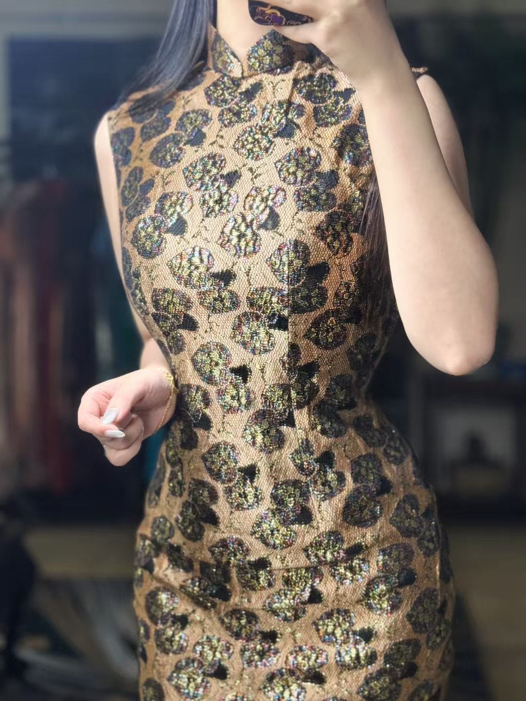 這件旗袍代表著 60 年代港式時尚的大膽與精緻。它告別了戰前的素雅,以如此高調的奢華面料搭配經典的無袖、修身剪裁,讓女性身體曲線在閃耀的金色中盡情綻放。穿上它,彷彿能立刻踏入那個充滿爵士樂和迪斯科霓虹的黃金時代,將所有目光匯聚於一身。