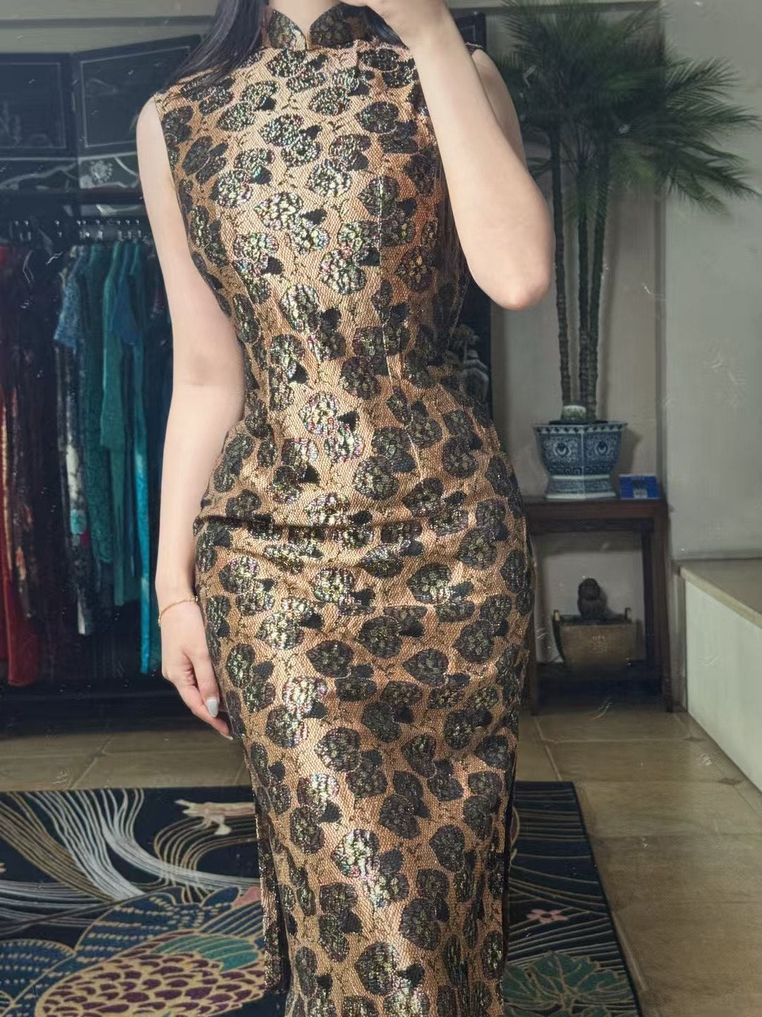 This Qipao symbolizes the bold sophistication of 1960s Hong Kong fashion. It moves beyond the austerity of the pre-war period, utilizing such a high-profile, luxurious fabric combined with the classic sleeveless, figure-hugging silhouette. This design allows the female form to fully flourish within the shining gold. Wearing it feels like instantly stepping into that Golden Age of jazz music and disco neon, drawing every gaze towards the wearer.
