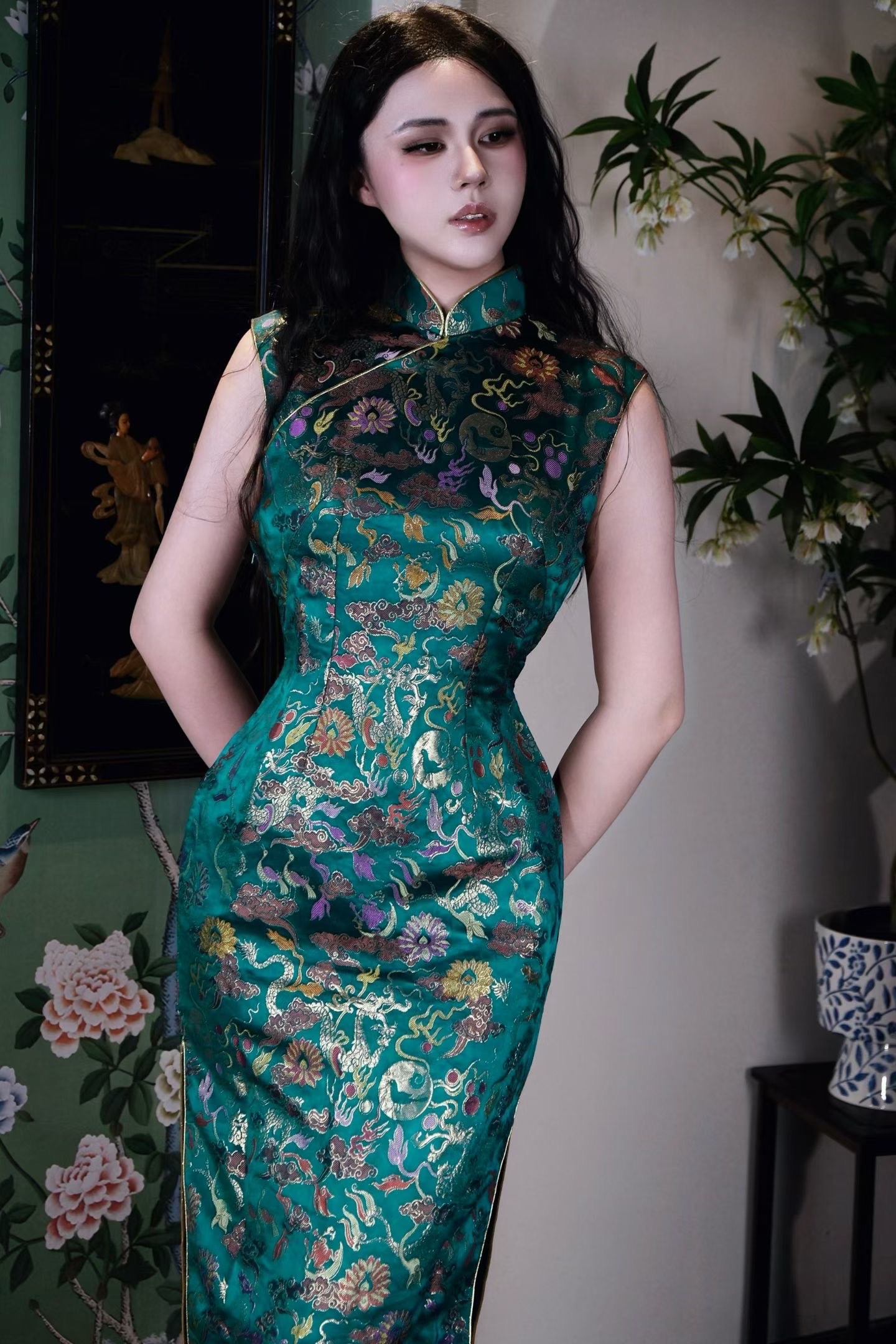 Today, the azure-green satin of this qipao remains like the "sky-blue after the rain silk satin" described by 1960s Hong Kong novelist Yi Shu; the gold threads emit a matte sheen in the light, and the Cloud Dragon motifs seem poised to leap from the fabric. It is not merely a garment, but a flowing silk history book—using gold thread as ink and auspicious clouds as paper, writing the fashion poetry of Hong Kong's Golden Age, waiting for the discerning eye to gently turn its page.