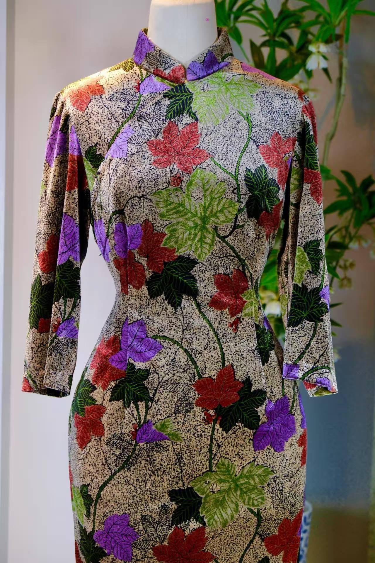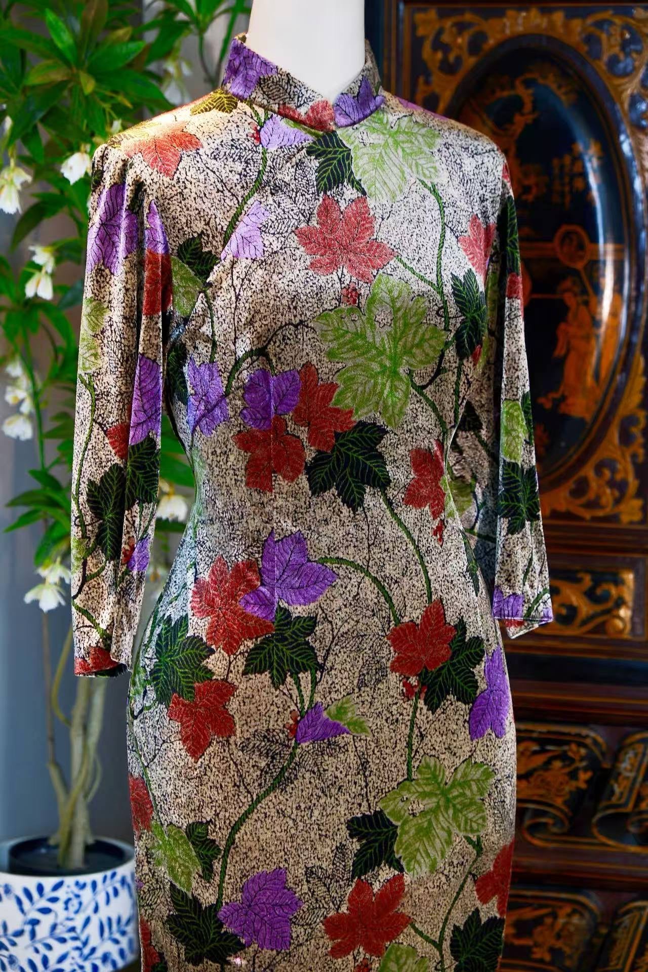分享一件上世纪六十年代香港金产丝绒古董印花旗袍:叶影流年,