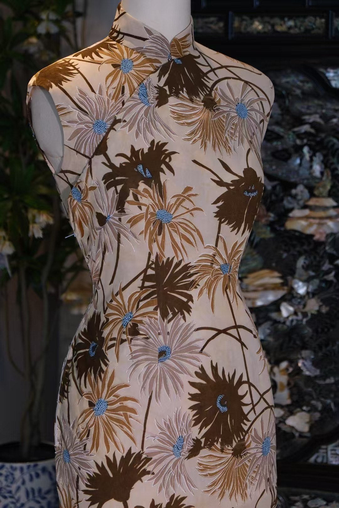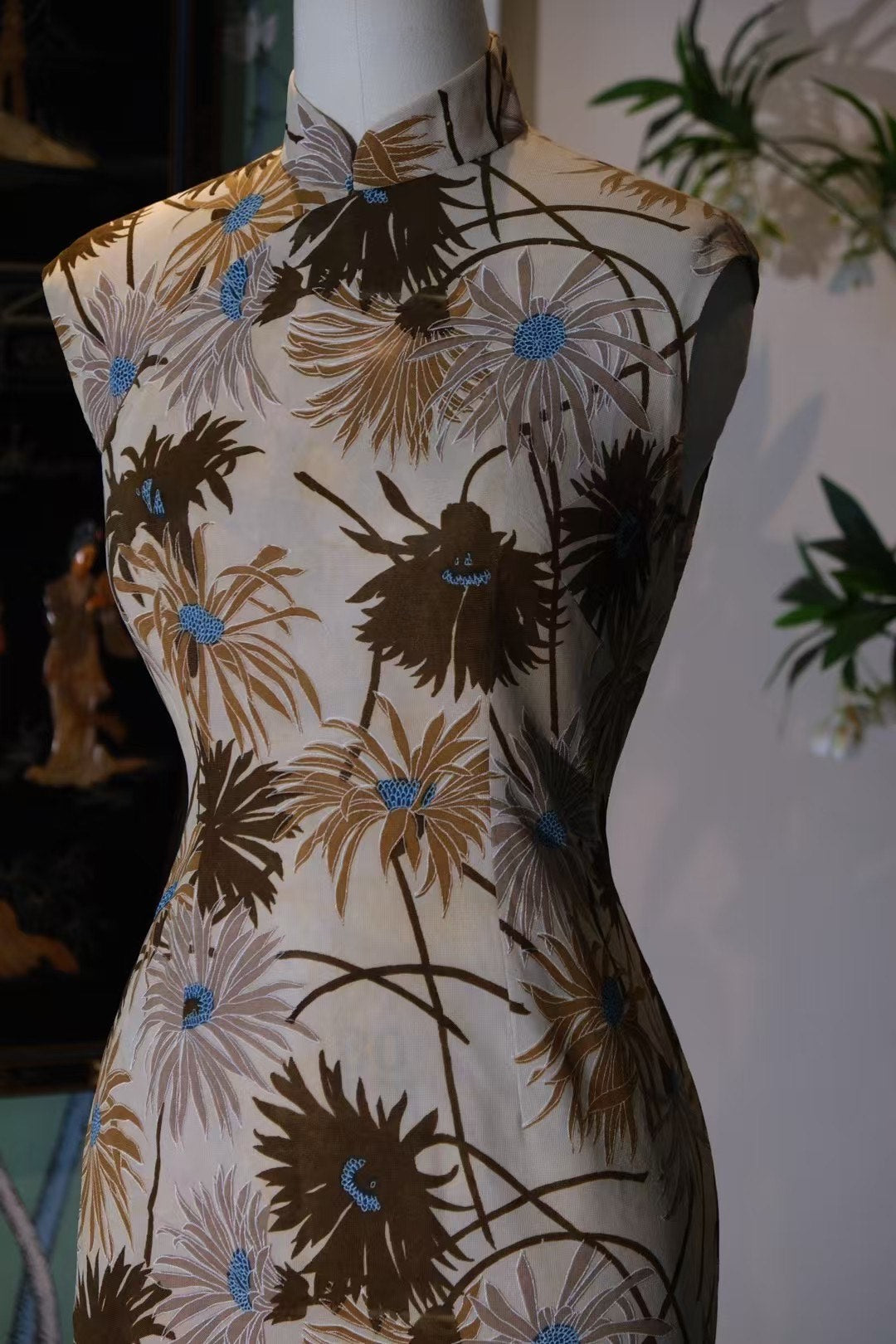 它将时光的温柔与摩登的利落巧妙融合。旗袍的底色是温暖的驼棕,如同秋日午后铺陈的绒毯,沉静而富有质感。其上的层叠菊影,以浓郁的摩卡色与柔和的浅棕交织,仿佛深浅不一的墨笔轻皴,描绘出一种兼具写意与复古的图案。最是点睛之笔,在于花蕊处那一抹清冷的靛蓝,如雅致的留白,在美拉德色系中跳脱而出,赋予了整体造型一份清隽的现代感。