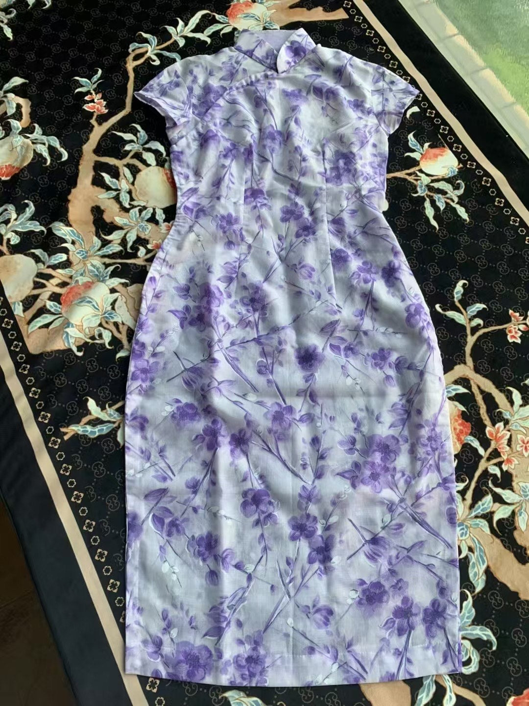 这件旗袍,捕捉了初春时节最温柔的一抹紫,将浪漫和清丽巧妙地融为一体。