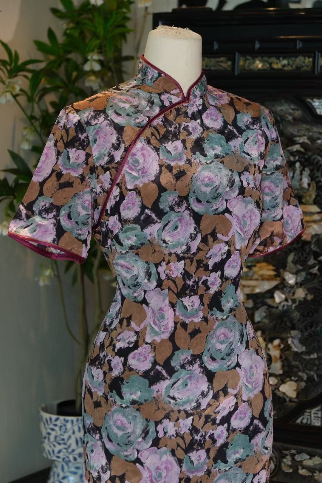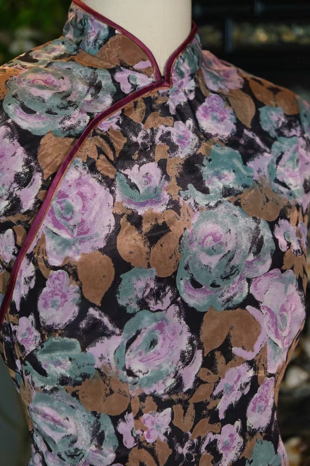 设计精髓: 经典的斜襟与立领,搭配酒红色的滚边,清晰勾勒出旗袍的轮廓,如同画框般锁住了花团锦簇的美景。短袖设计(可能是盖袖或小飞袖)优雅地修饰手臂线条,在保持传统端庄的同时,更添一份复古的俏丽与日常的实用性。