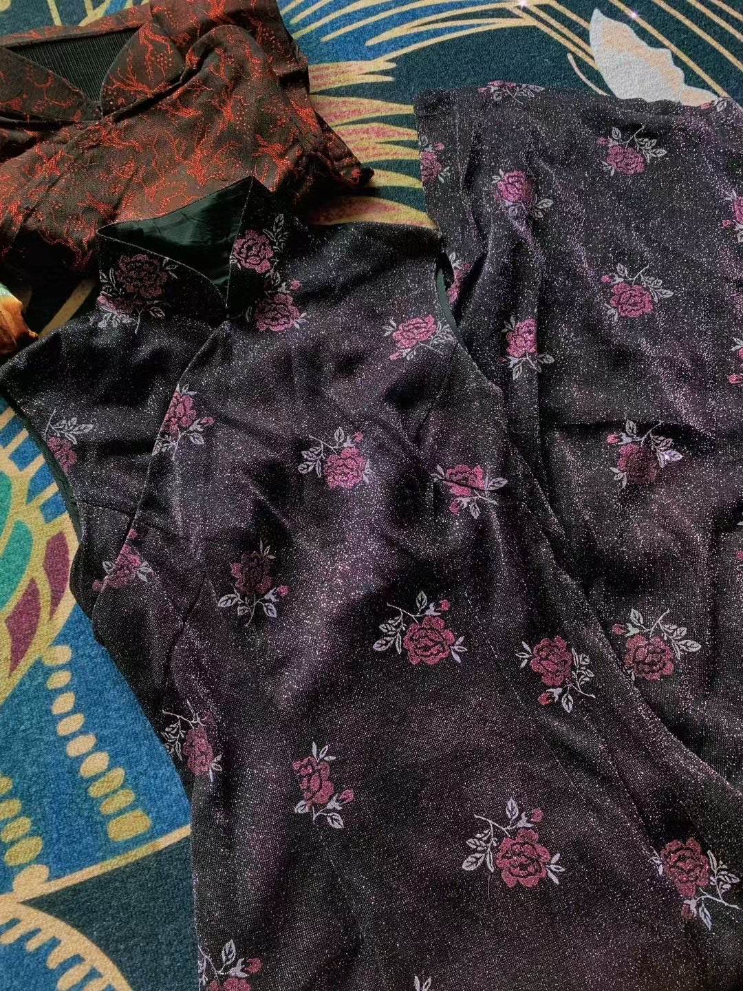 60 年代: “午夜玫瑰·闪耀迪斯科” 炫黑闪光底玫紫玫瑰印花无袖改良旗袍 | 1960s:"Midnight Rose & Disco Sparkle" Black Shimmer Base Fuchsia Rose Printed Sleeveless Modern Cheongsam