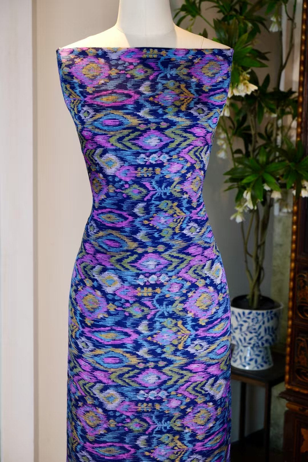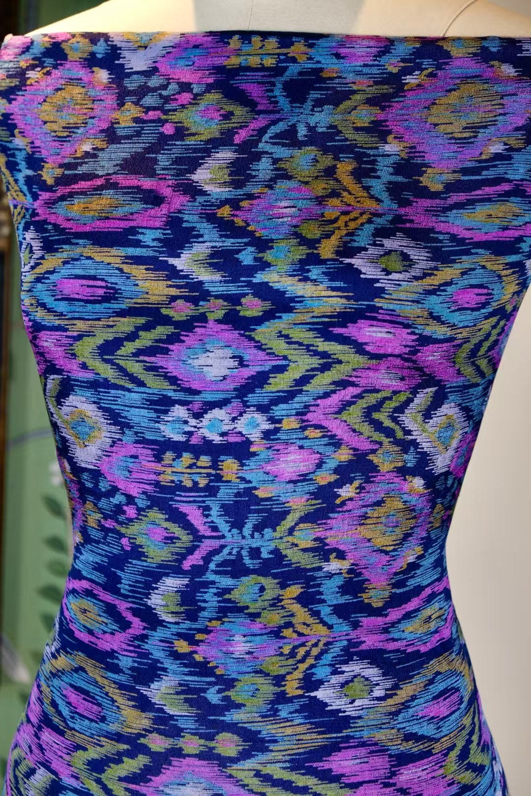 它散发着一种游牧文明的异域感,却又因其明亮、大胆的配色而充满了波普艺术的时尚气息。每一个几何线条的边缘都带着微微的晕染感,仿佛在高速流转的光影中捕捉到的瞬间残像。它不仅仅是一块面料,它是为那些渴望打破常规、追求极致个性的设计师准备的视觉宣言。