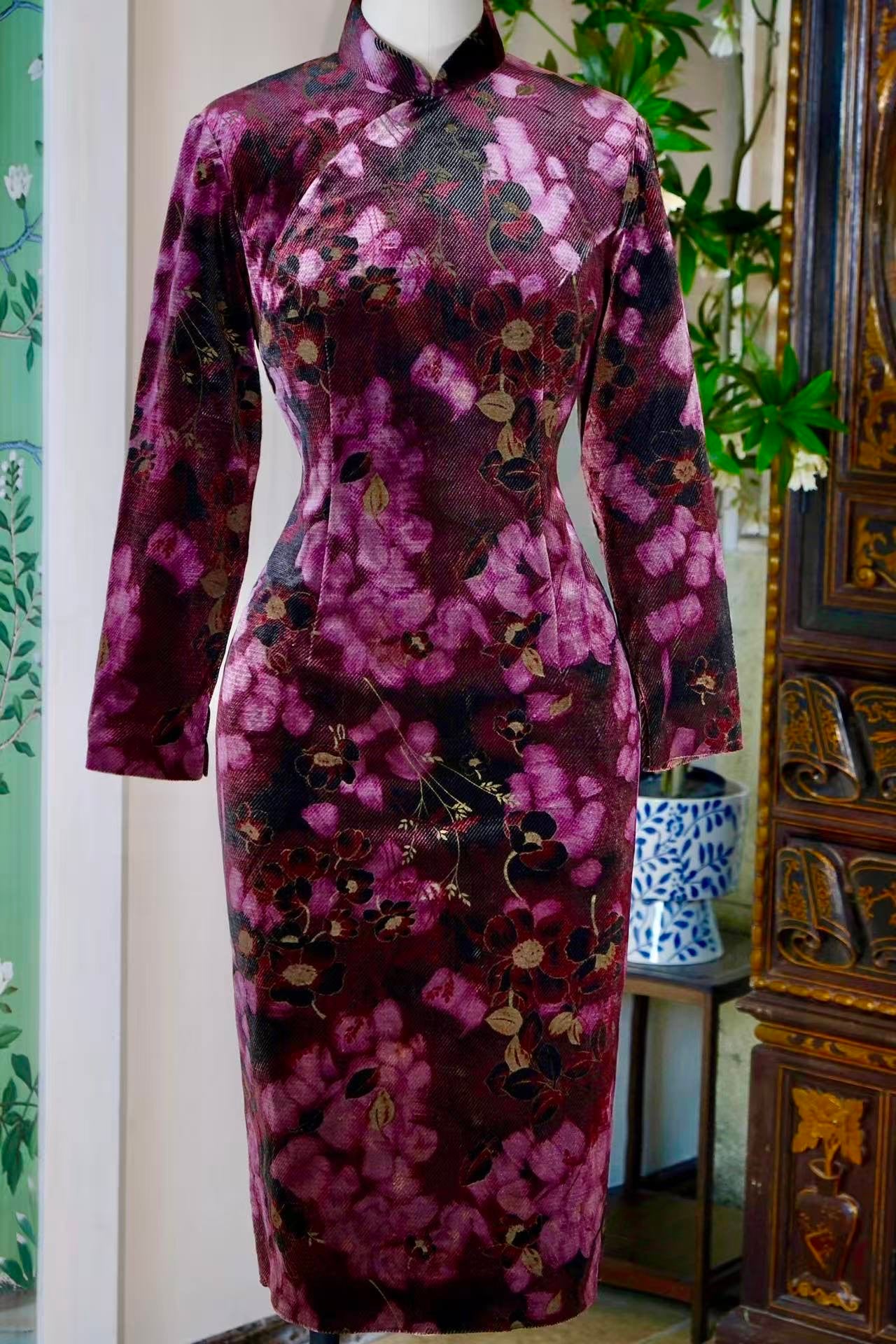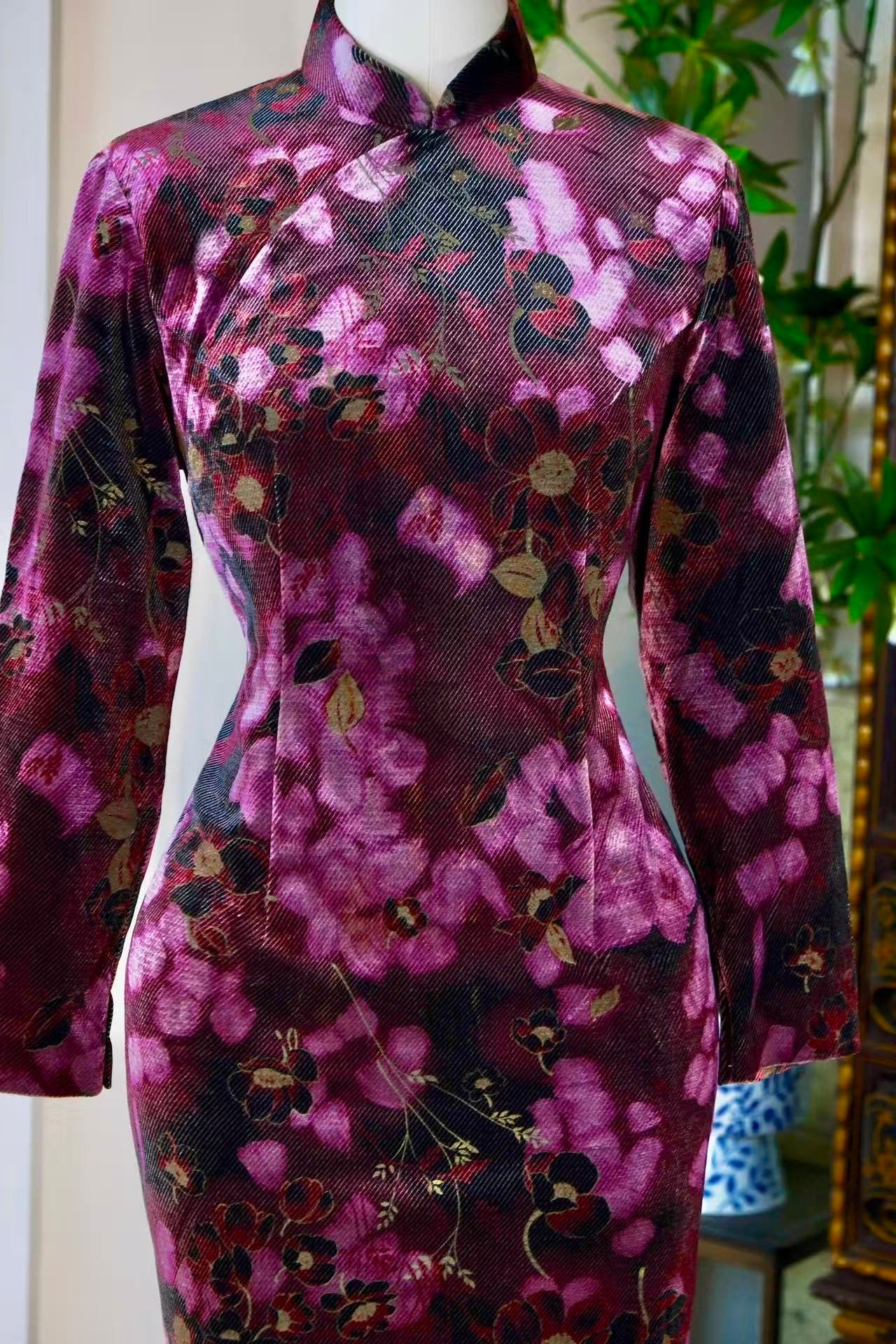 This Qipao is anchored in twill corduroy, a material that emerged in the 1960s as an innovative choice for its warmth and rich tactile depth. The vertical ribs of the corduroy, when married with sophisticated printing techniques, create a rhythmic interplay of light and shadow. The deep purple base exudes the solemnity of evening mist, upon which clusters of mauve and pink blossoms seem to float. Under shifting light, they evoke the classical imagery of "purple paths and the brushing of red dust"—a bustling, poetic elegance. Most exquisite is the gold-foil (gilding) process: gold dust is meticulously applied to the stamens and leaf veins, reminiscent of the "gold-powdered balustrades" described in ancient Song lyrics, fusing traditional metallic weaving aesthetics with modern sensibilities.