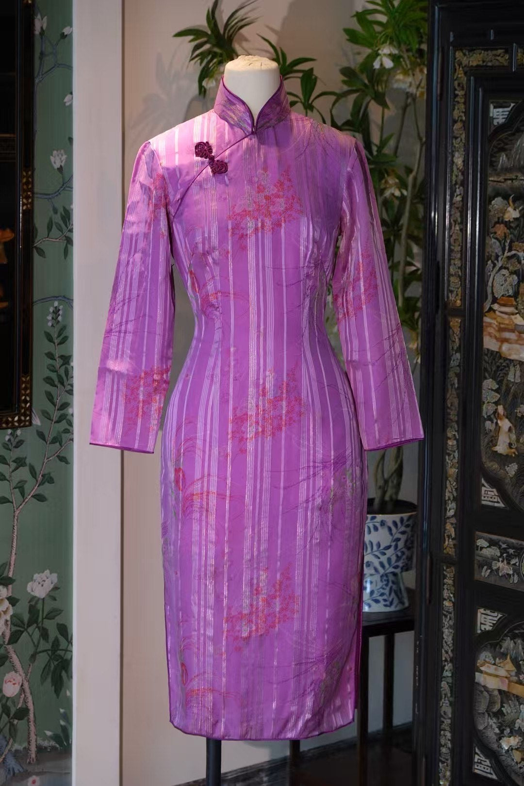 【紫韻流金】(第三件紫色长袖及膝): 紫羅蘭色的長袖旗袍,以銀線勾勒出豎向條紋,點綴著若隱若現的櫻花暗花,將古典的含蓄與現代的浪漫完美結合,是出席重要場合的精品之選。
