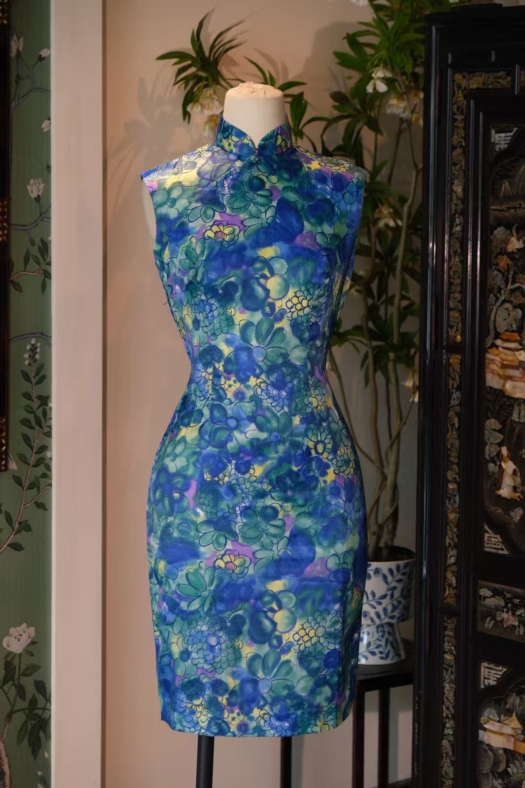 【碧波流光】(第一件蓝绿花纹无袖): 那一件無袖短款旗袍,以濃郁的寶石藍與翠綠暈染出抽象花卉,充滿了摩登氣息,活潑而大膽,正是當年名媛在雞尾酒會上展現自我風采的時尚寫照。