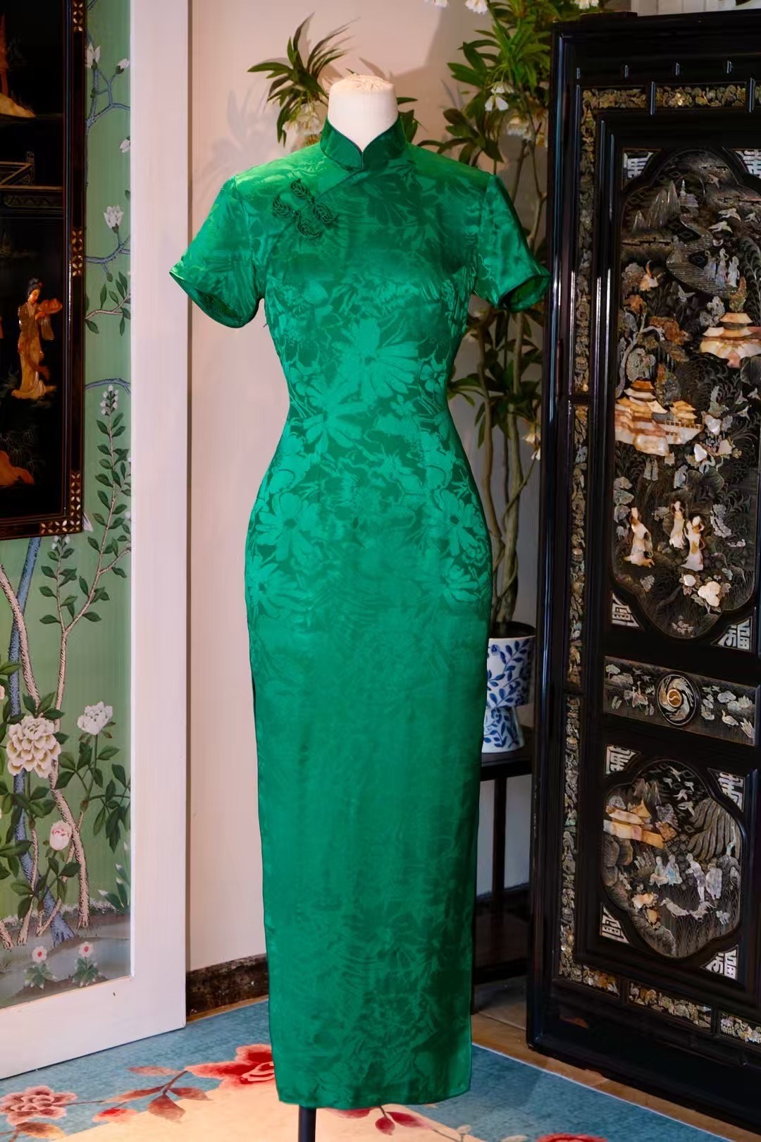 【Emerald Brocade Dream】(The second green short-sleeved long): This emerald green jacquard long Qipao, whose silk gleams like premium jadeite, features subtle, intricate patterns. It is stately and elegant, enhancing the wearer's noble demeanor and exuding Miss Hong Kong-level luxury and solemnity.
