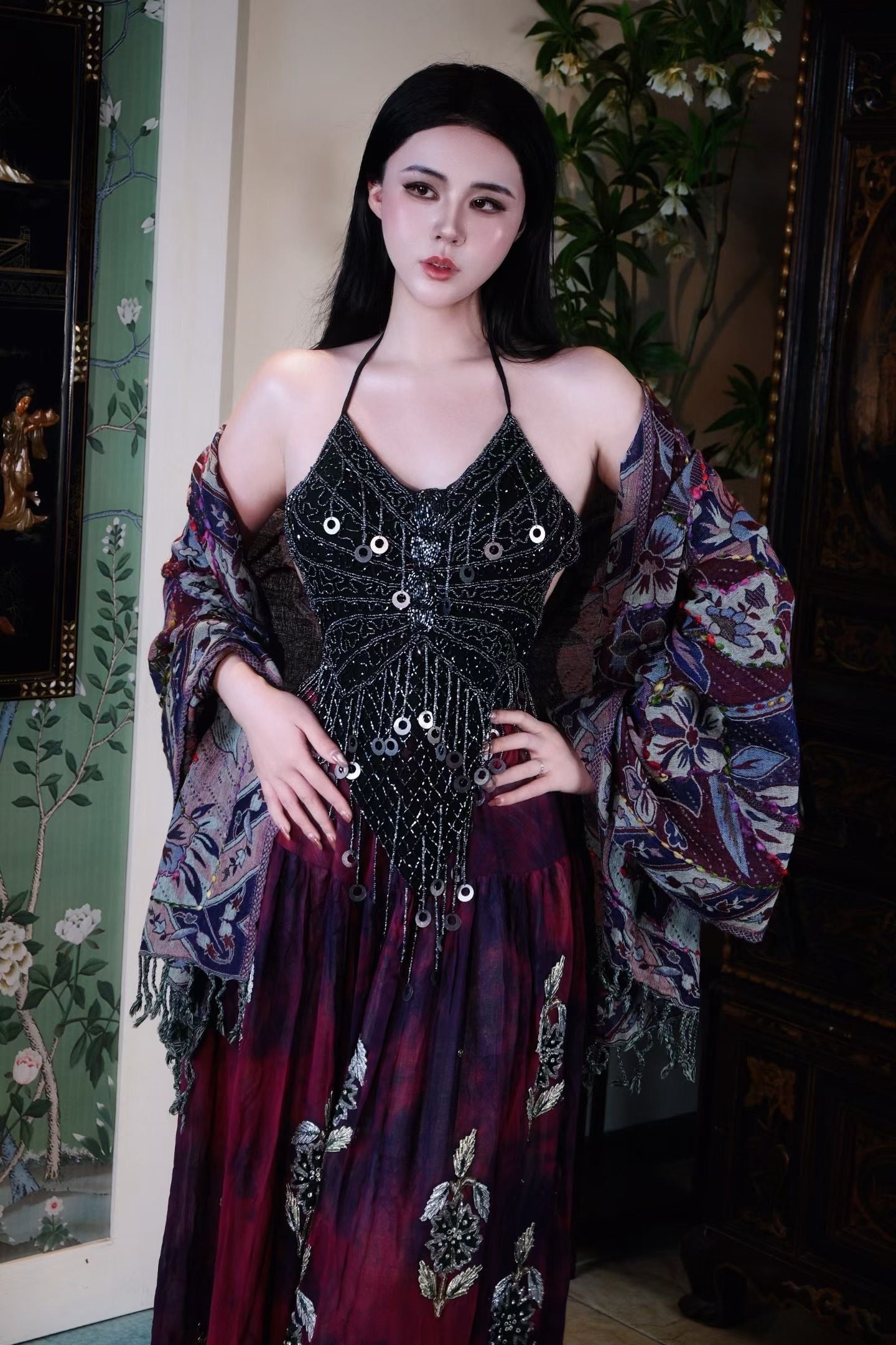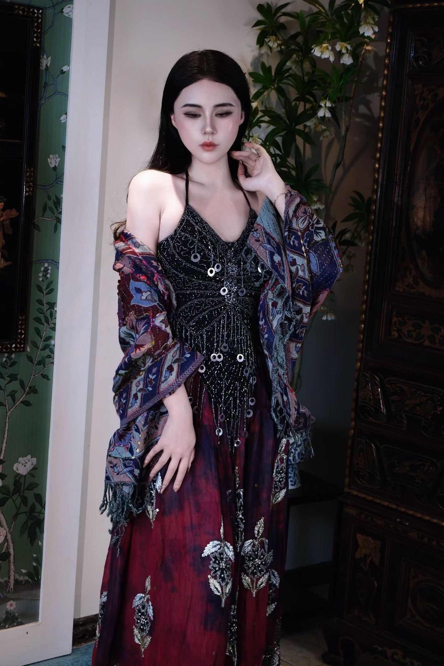 A Magnificent Narrative Across Centuries Where vintage soul meets modern craftsmanship, this three-piece ensemble becomes a living textbook of retro aesthetics. The black hand-sequined camisole weaves a galaxy of fringes and beads; the vintage tie-dye full skirt stains the traces of time with gradient burgundy; and the cashmere wool wrap adds a stroke of effortless nobility to autumn with its vibrant patterns.