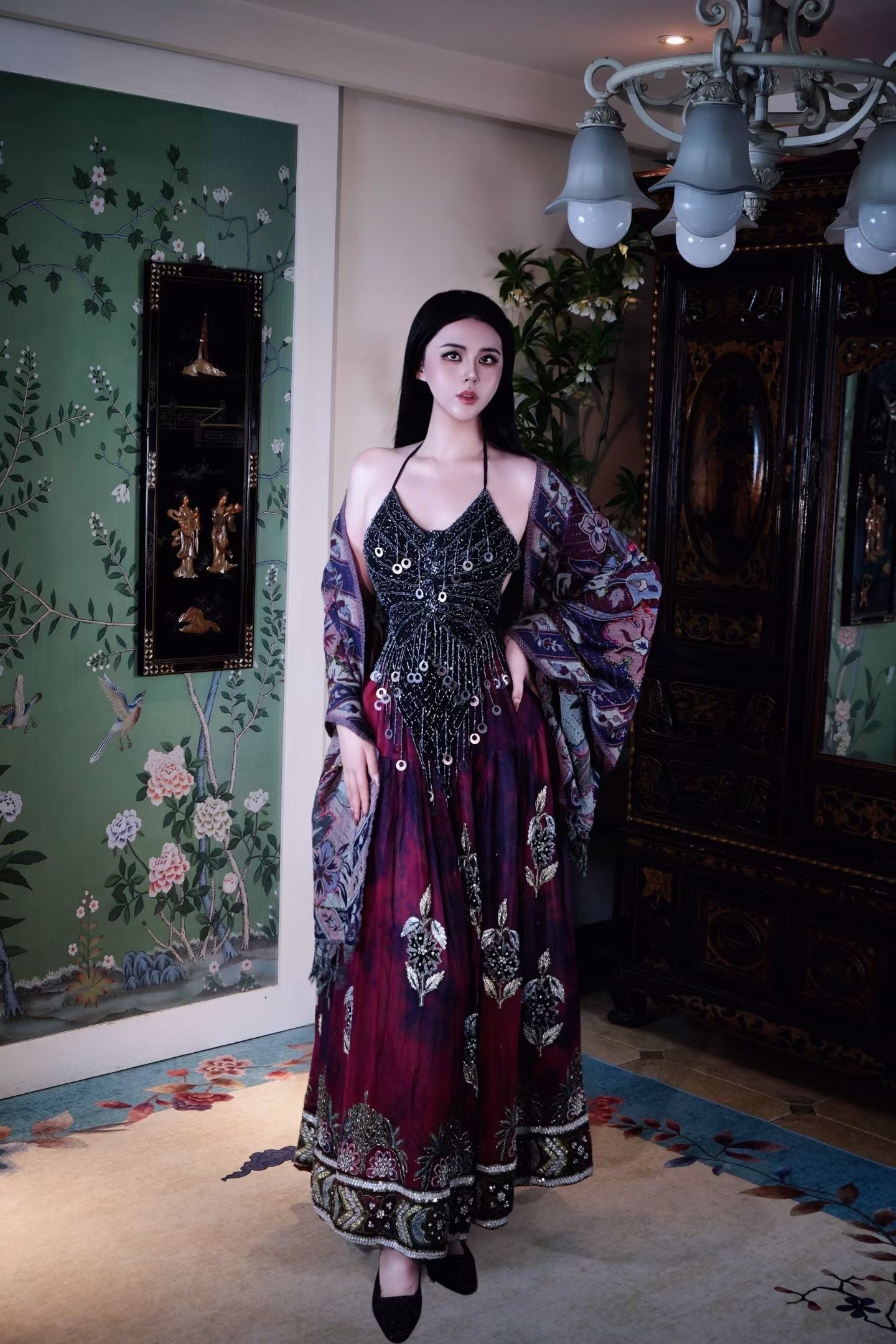 时空交响·复古奢华三件套:手工亮片吊带+扎染流苏长裙+